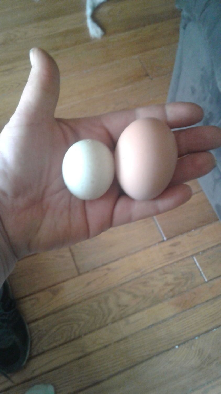 The chicken egg on the right is about the size of your average large egg from the grocery store.