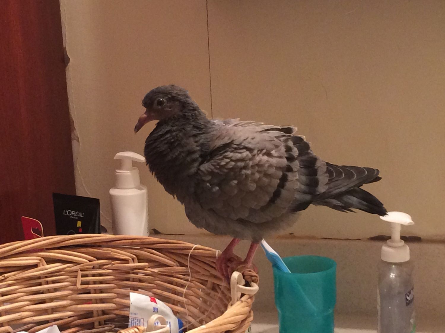 The missing feathers on his head is a sign he got attacked and 'scalped' by other pigeons. Usually a male will do this trying to take over the nest. That may be how he got to be in the parking lot.. kicked out of his nest.