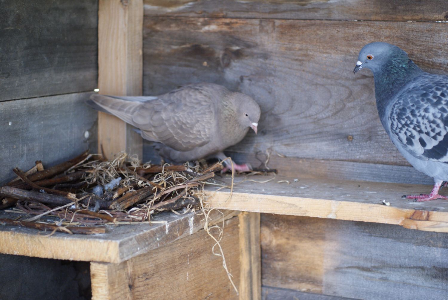 my lovely CapuchinXOriental roller mix, and the chick she hatched. They still stay together, even tho they're in the coop with the other pigeons now. It's so sweet