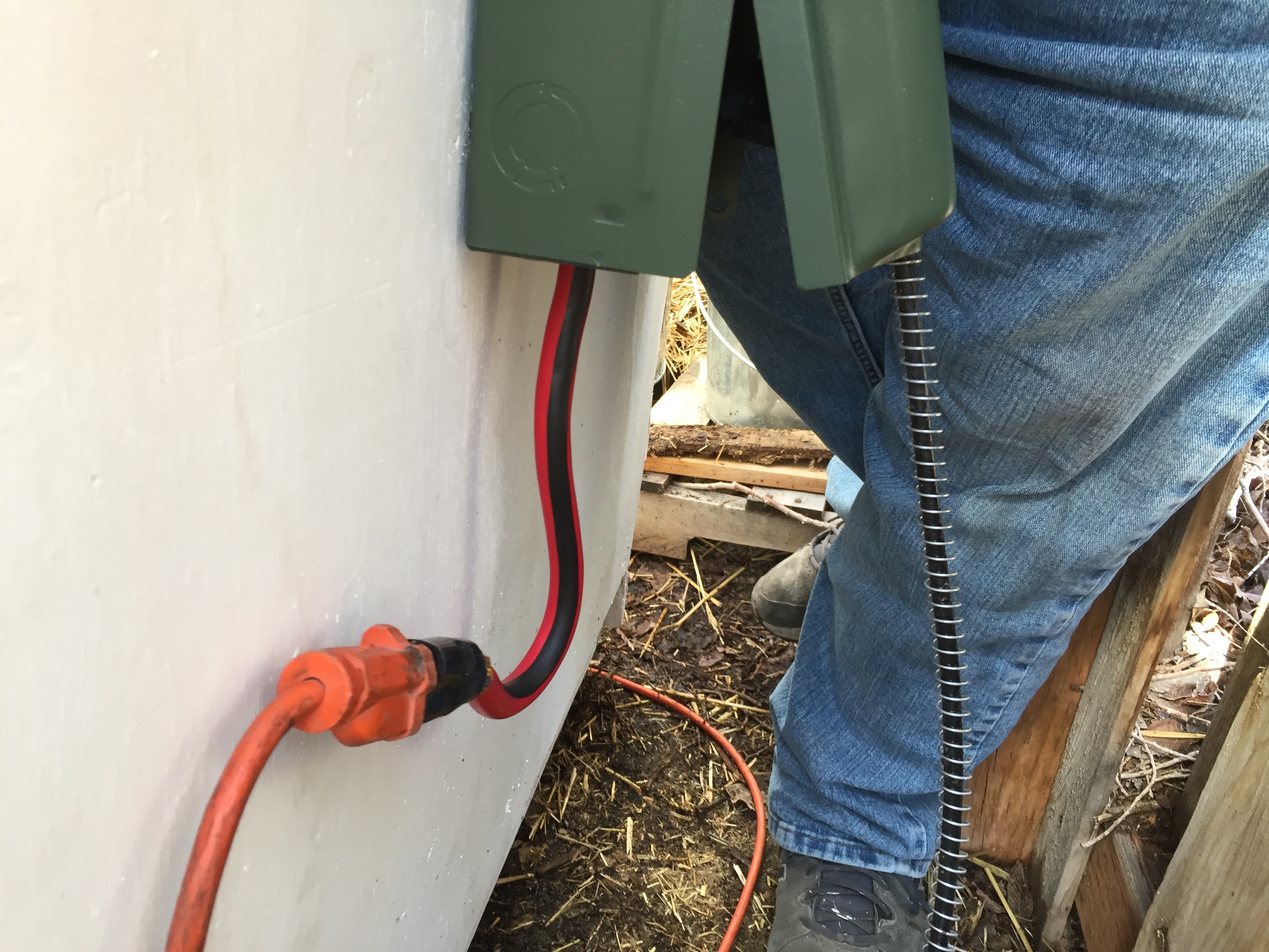 Electrical is provided from an extension cord fed thru a GFCI outdoor box that also feeds the waterer in the run.