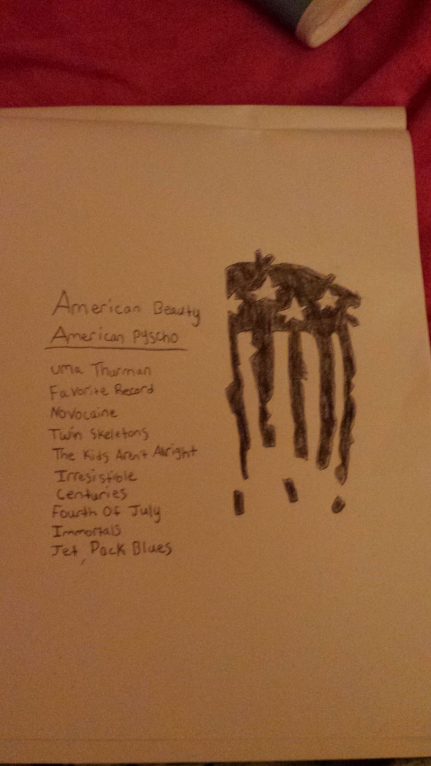 I drew this yesterday, it's all of the songs off of Fall Out Boy's new album "American Beauty/American Psycho" and the little drawing is their album cover without the face.