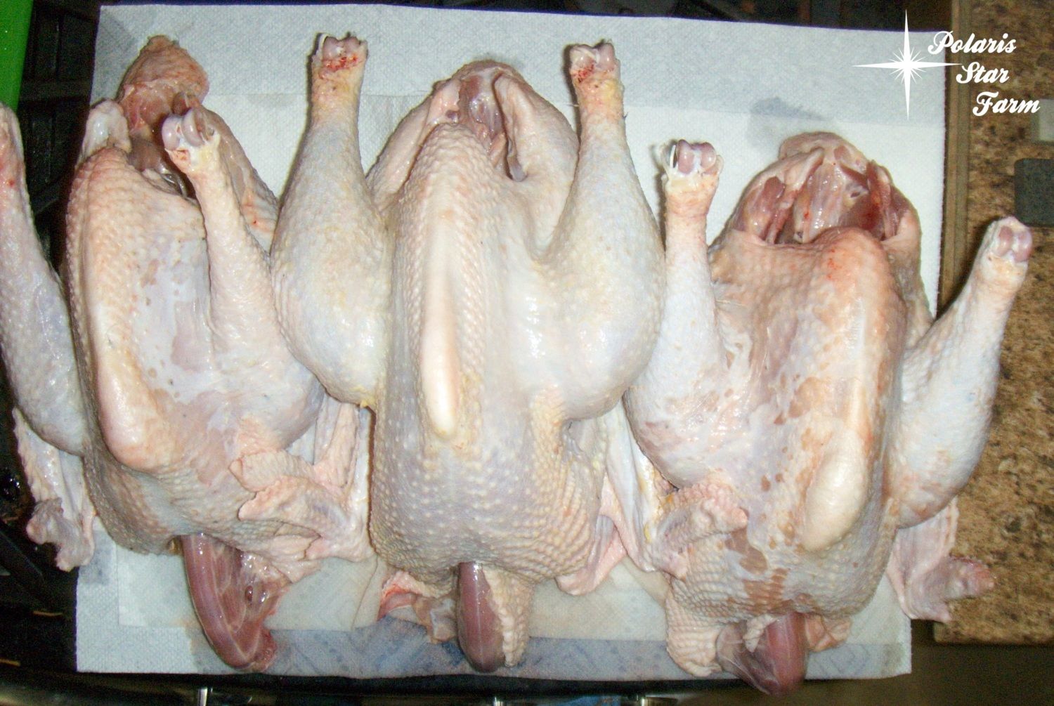 The ones on the outsides were the same age - 5 months old. The one on the right dressed out at 4 lb 15.75 oz. The one on the left, the same age, dressed out at 3 lb 12.5 oz.