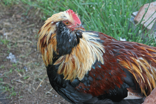 These guys have really dark red and often have a lot of red in their beards and this boy is even developing some red in his wing triangle. They also tend to have much richer yellow coloring in hackle and saddle feather with a lot of reddish tint. While they do have a LOT more red than most Salmons, Leisha and Keesmom are right - they are not mahoganies. I don't even consider my girls to be mahogany yet as I think the color needs to get MUCH darker.