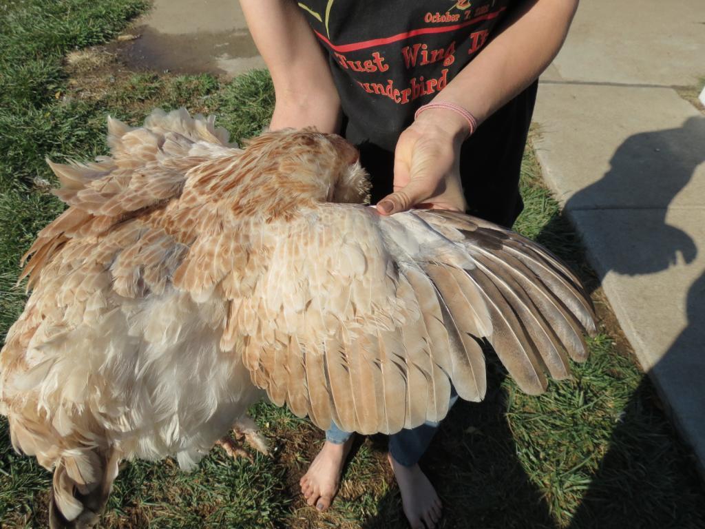 And from the front (her muff is actually a bit fuller than it appears. The birds are wet and a bit dirty from freeranging after heavy rains):