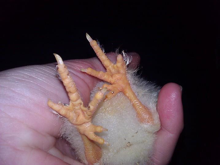 This is the foreground chick, fluffier face and hatched out the color of spring cream (pay no attention to the crud stuck to her foot, it was schmutz, not a scab or skin discoloration). She's thrashing like mad to get away from the camera, so it's hard to see that her fifth toe is usually well separated, pointing almost back up her leg. Angry chick is angry.