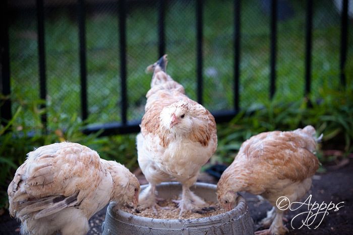 We ended up with two pale ones and two darker. Their ages range from 9-11 weeks. Here are photos of three of the four, the littlest one wouldnt get its head out of the other feed dish lol In fact they are all rather hungry this morning, they have not stopped eating since I let them out.