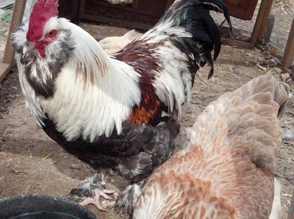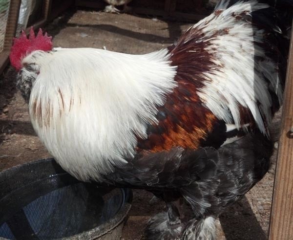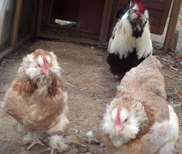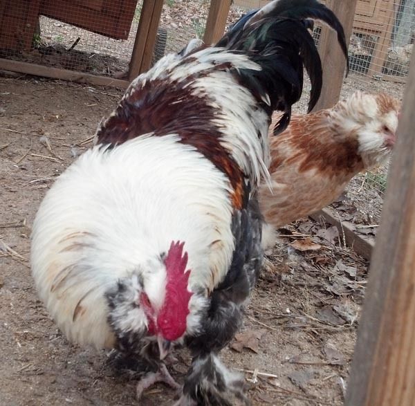 Here is my Salmon Faverolle Roo and a couple of his hens. Hatched these from Sandiclaws eggs some time back. I really love these birds. They are the friendliest chickens I have and I really think the Roo is gorgeous.