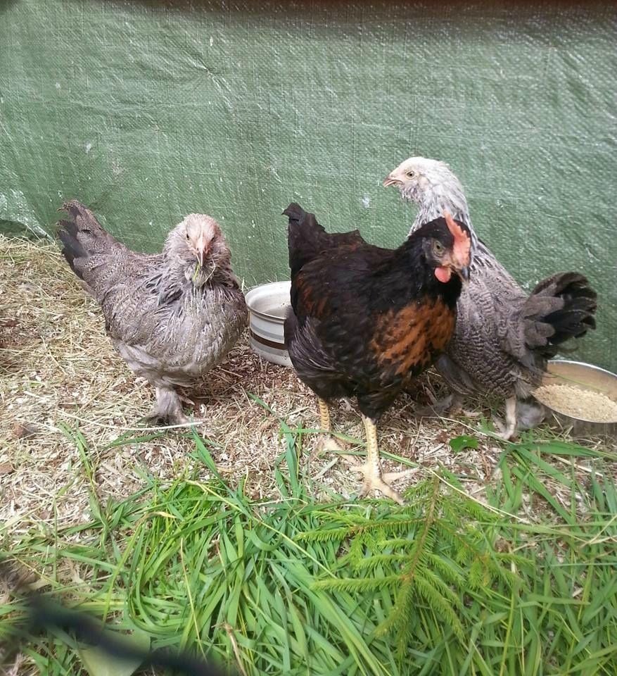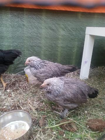 HI, these really are an interesting coloration….Please share more as time goes by…..I've never seen these. They look like they're birchen faverolles? the blue ones look like the salmon except where the salmon have black they have blue. Your birds look like a project, I might be interested in some eggs later on to continue this project.