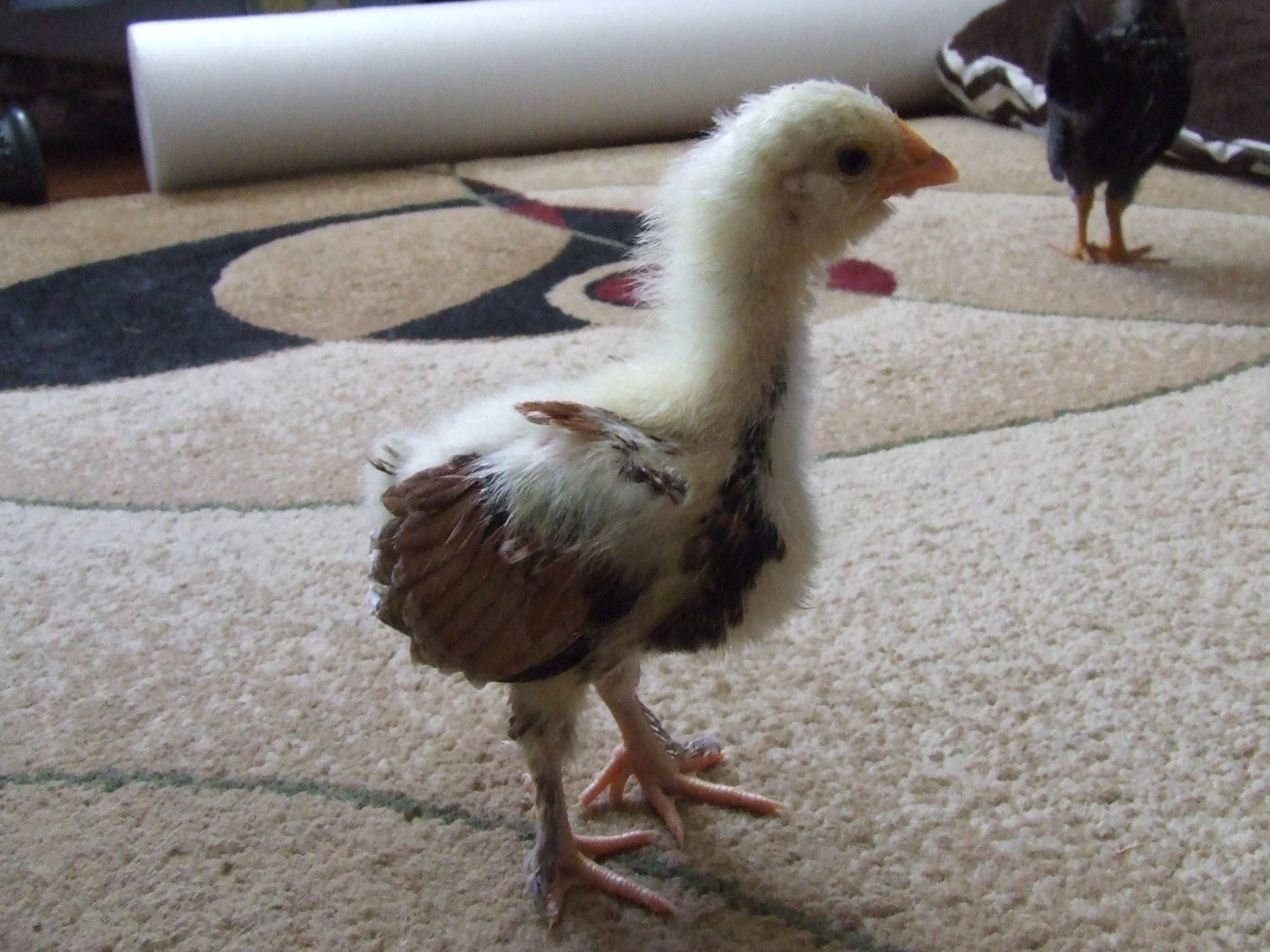 Here is my MPC hatchery girl at 3 weeksI thought for sure that my 5 week old LF Salmon Faverolle was a girl, but now I'm starting to question it. I already have a Salmon Faverolle cockerel, and my girl is starting to feather in like him only not as dark. Is it possible she's just of poor hatchery quality or do you suspect roo also? I got her from a local family that runs their business out of their home. I think the family gets their originals from a big hatchery though.