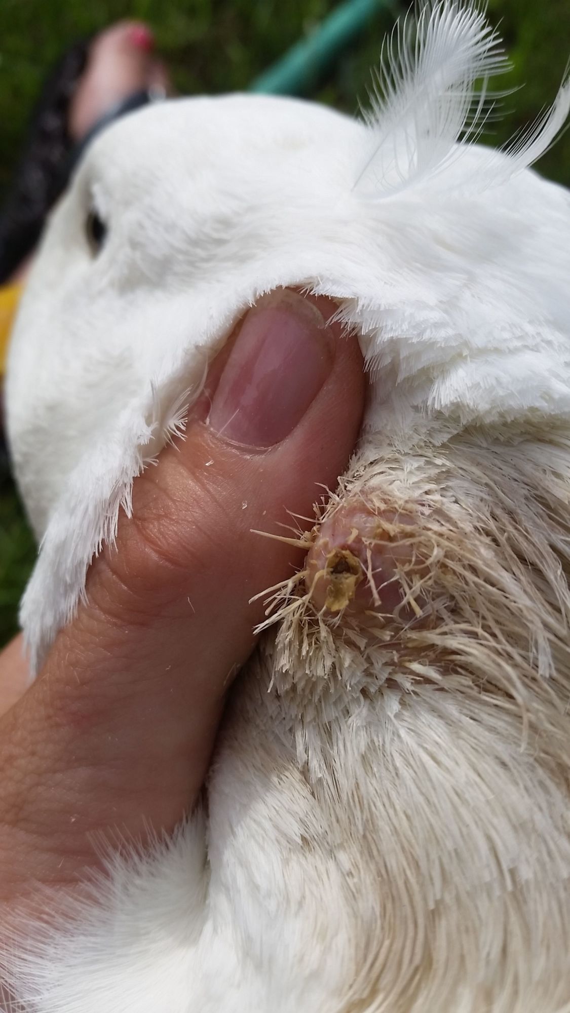 One of my pekin I noticed a "hole" on the side of her neck about 2 weeks ago. When I checked it out I saw a what I would describe as a white hard (looked to me like a bone spur) fragment. I have been giving her terramyacin ointment topically as well as oral antibiotic. I shaved the area around the site so air could get to it. It is still not getting any better. There is a large cyst like lump and then a scab, which today I noticed was being pushed out more. I pulled on it and about an inch long hard thing came out. I pulled that apart and indeed it was feathers. No puss drainage. Any suggestions or advice would be greatly appreciated! Unfortunately there are NO avian vets anywhere near me and every vetime I call does not no enough about ducks to see her. She is eating as normal, drinking and swimming. I'm new to this forum as well. Thanks in advanced!