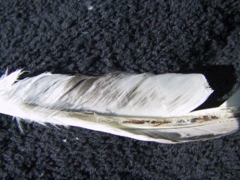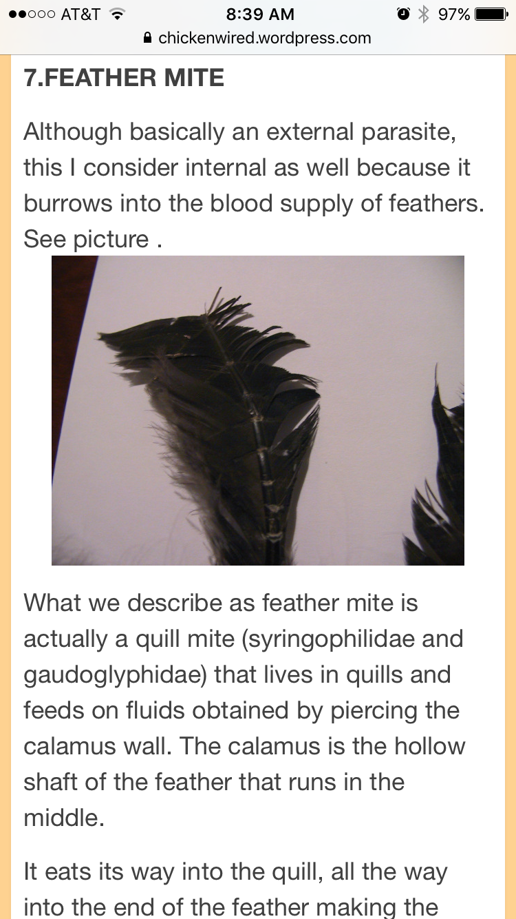 BYC members my chickens are all mess up.. Any idea what this might be?? I noticed for awhile thought Mayb cage damage but closer look even the new feathers are showing signs of lines going across and looks like something eating at it... Hen and rooster cage together... Hen shows small signs this picture is from rooster with most damages.. Seems to be molting atm ... But even new feathers growing out like that?? Lots of dandruff