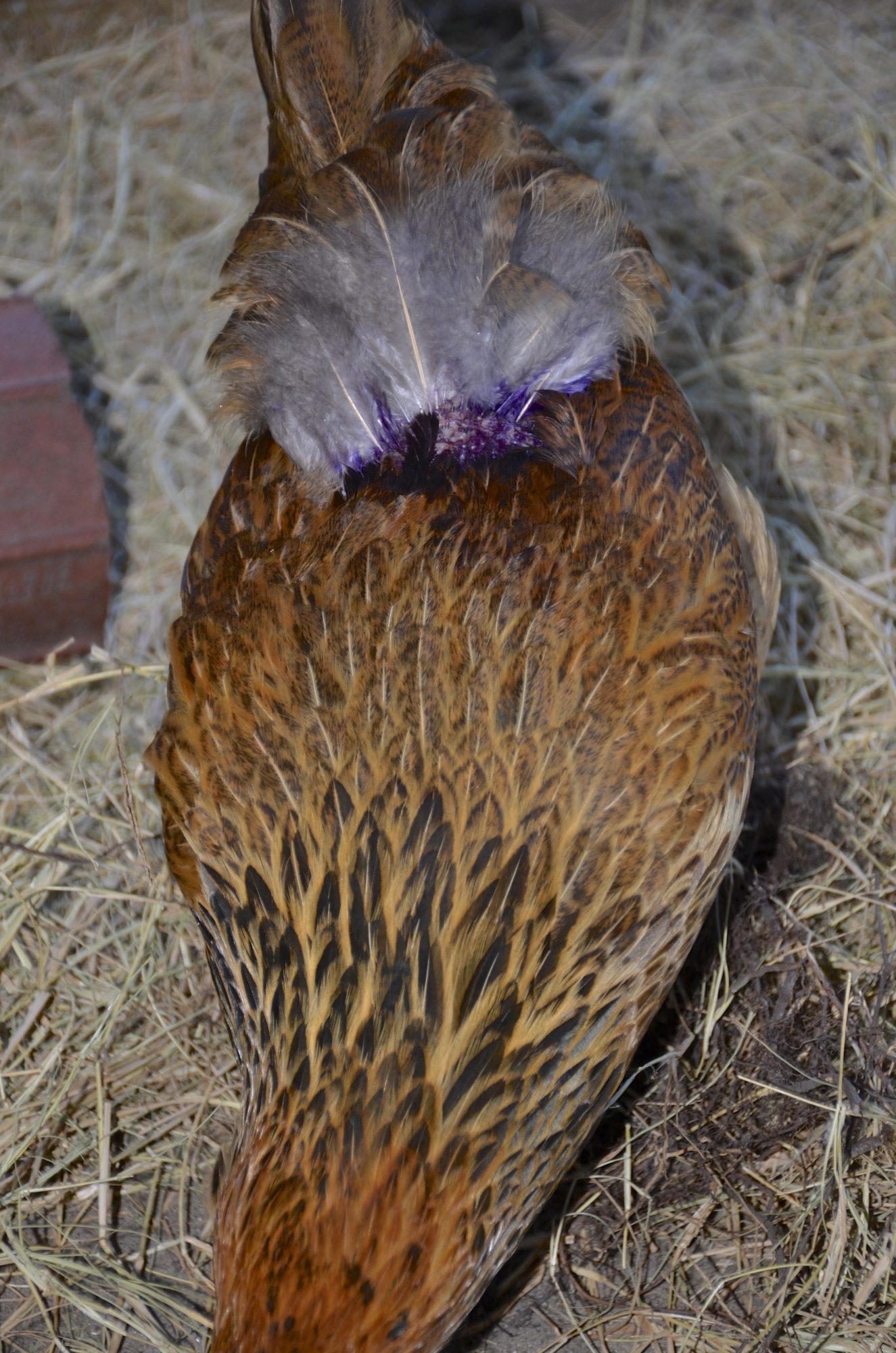 Here are new pictures of my hen. I have tried everything everyone has mentioned, in the previous posts!! Currently, I have her isolated & have given her Sulmet for the last 48 hrs. I am also spraying her skin with Vetericyn. I have treated the coop 2X with Seven Dust, over the past 2 weeks & this Saturday would have been my 3rd treatment, when I clean the coop. It's as if something is eating away her skin??? Can someone please help???!!! I have contaced two locall veterinarians & (1) believes it may be a contusion wound, from the others pecking at her. She did admit she does not specialize in fowl & the other is checking her college/academic books & also doesn't specialize in fowl; I can't seem to find someone that does. Our local, small feed store owner also has chickens & says he has never seen anything like this; he recommended the Sulmet & the 1st vet recommended the Vetericyn for the next 5 days. You can see that her vent doesn't have "eggs" around it & little debris, as I keep looking for mites or fleas. Please help, as I am worried we are going to lose her!! Thank you...