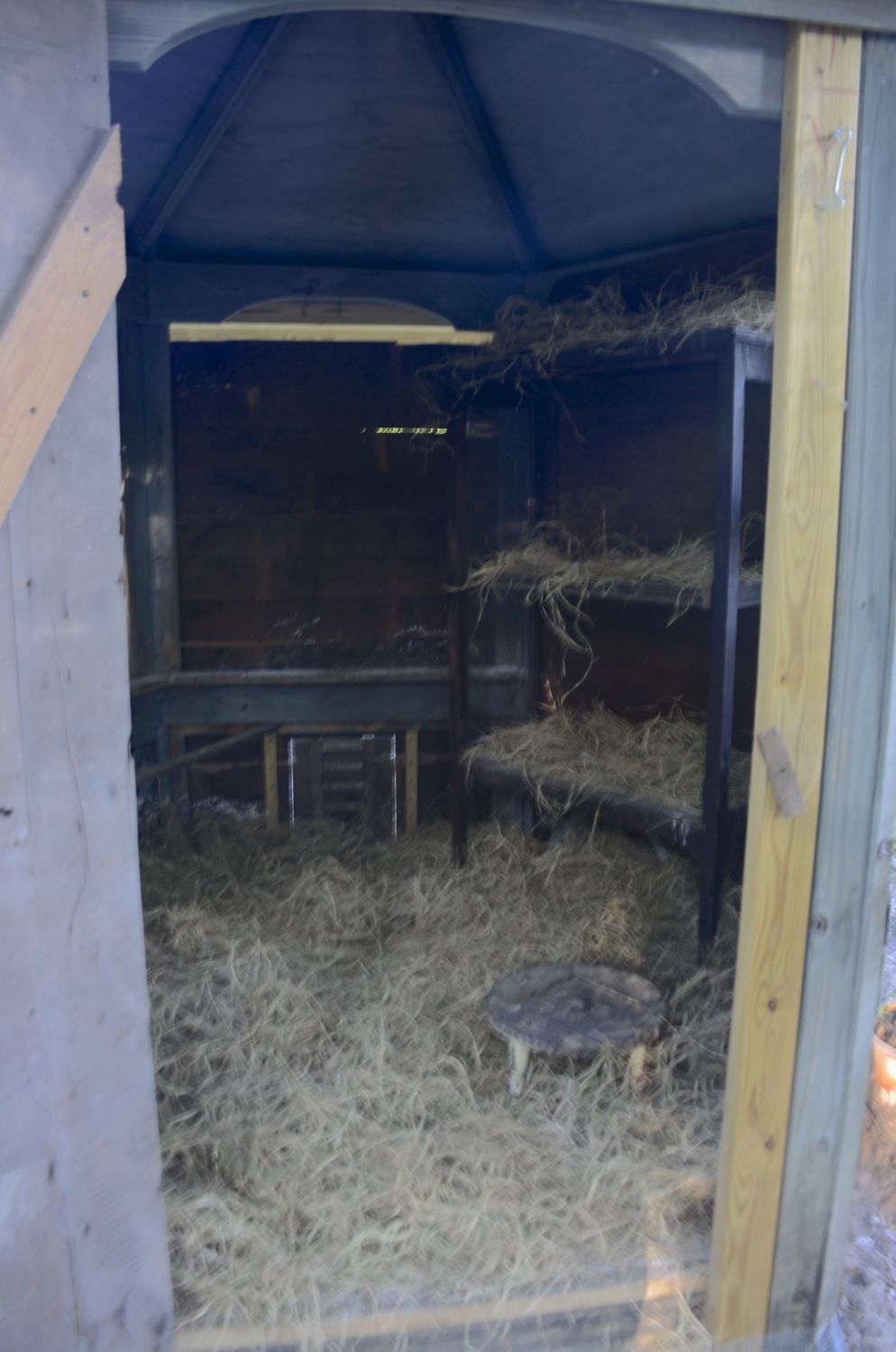 The top (2) are pictures of my Ameraucana hen & her back. The bottom (2) are pictures of my Ameraucana rooster & his back. I did break down & put Seven 5% dust in the coop & attached "yard". I have tried to use DE & do everything naturally, but I don't want them getting any worse. We inspected under their wings & vent & didn't see anything other than a little dirty material, that looked like poop. In the event that this was debris from mites, I spoke with the lady @ our feed store & she told me to put down Seven dust & that it helped her chickens. I asked her if I should put it on my chickens & she said "no", only in the coop! We also built an 8' X 4' run & separated the (3) Ameracuanas from the rest of the flock, during the day, so they could get a greater variety of bugs & rest from pecking to their bald spots. I also bought a 20% protein feed, for the entire flock. I did not put the saddles on, b/c if it's mights, I didn't want to add another dark place for them to hide. The lady at the feed store did say that she thought it might be due to protein loss b/c the chickens aren't rolling in the dirt & she said that if they have mights, they will be rolling in the sand/dirt?? I am also attaching pictures of my coop (inside after being cleaned, which we usually do every 1-1/2 weeks) & inside/outside after new hay has been put down & seven dust was spread. I am hoping this visuals will enable you to help us, as we are doing everything we know & have asked/read to do & are "sick" that our girls & boy look so sad!!! I also still don't understand why it's only my Ameraucanas, as I have 8 other hens that appear to be unaffected & are from different breeds??? Thank you ALL, again, for your help <3