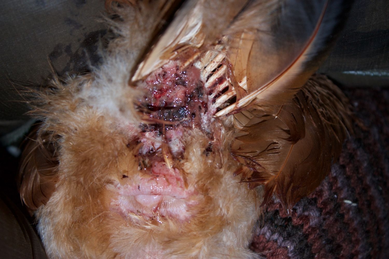 I have noticed that one of my hens has lost a ton of feathers on her back, wings and her tail. On closer examination I could see that the shafts are broken off, so it's not moulting. It's the middle of the winter here in Canada (the low tonight is -20C/-4F) so losing feathers is really bad. I'm trying to decide whether it could be feather pecking, lice or mites. She isn't acting super sick--she's eating and drinking properly--though she is staying inside the coop and not coming out (i think because it's so cold). From observing the flock, it doesn't look like she is getting pecked on, maybe the pecking is happening at night?