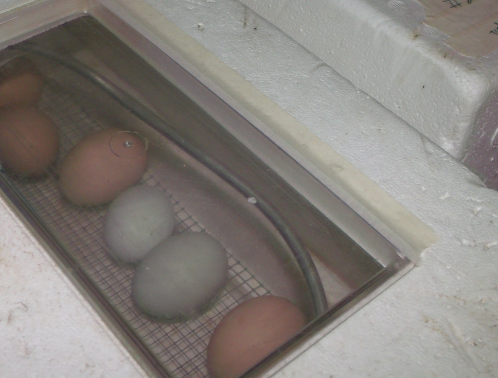 This thread is moving soo fast; so many new posts every day. To quote the lil girl from Despicable Me "It's so awesome!" Anywho, here's an updated pic of the first pipper. It's actually a few days early but it is the 'oldest' egg we collected. We can hear several different peepers in the box. The camera has a hard time focusing on the eggs, but the fist pipper is the green egg in the center.
