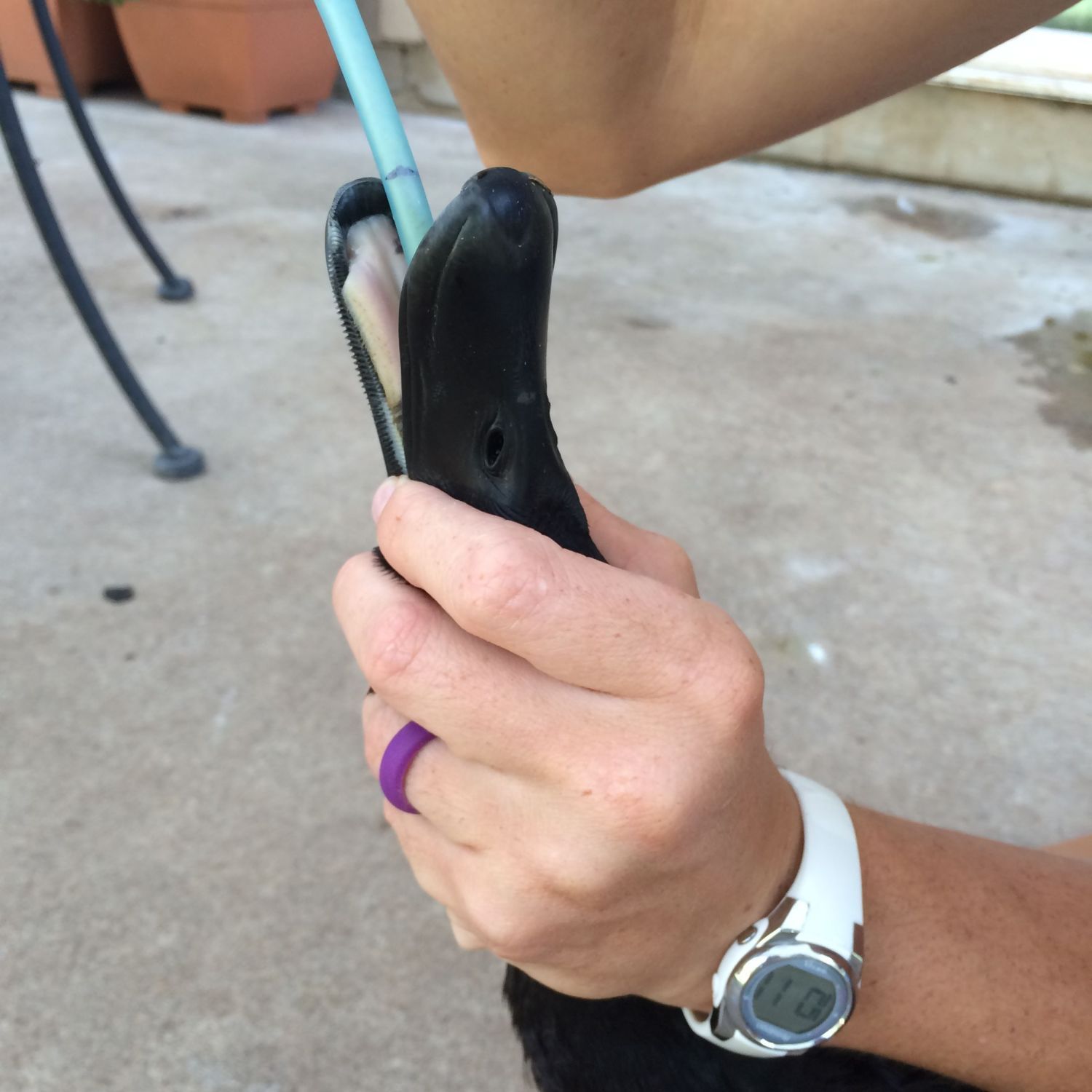 You're a pro! Over my ovation limit already today or I would have given you one. Those are great pictures!I got some pictures of the feeding and worming today. My 4 year old took the pics and I think he did pretty well. First up is Rocky my cayuga whom I'm the most worried about. The 35mL of Kaytee Exact bird food mixed at 1 part food to 2 parts (plus a little more) water. Also mixed in is the wormer and extra air in the syringe to ensure all the mix is given and nothing is left in the line when done feeding.
