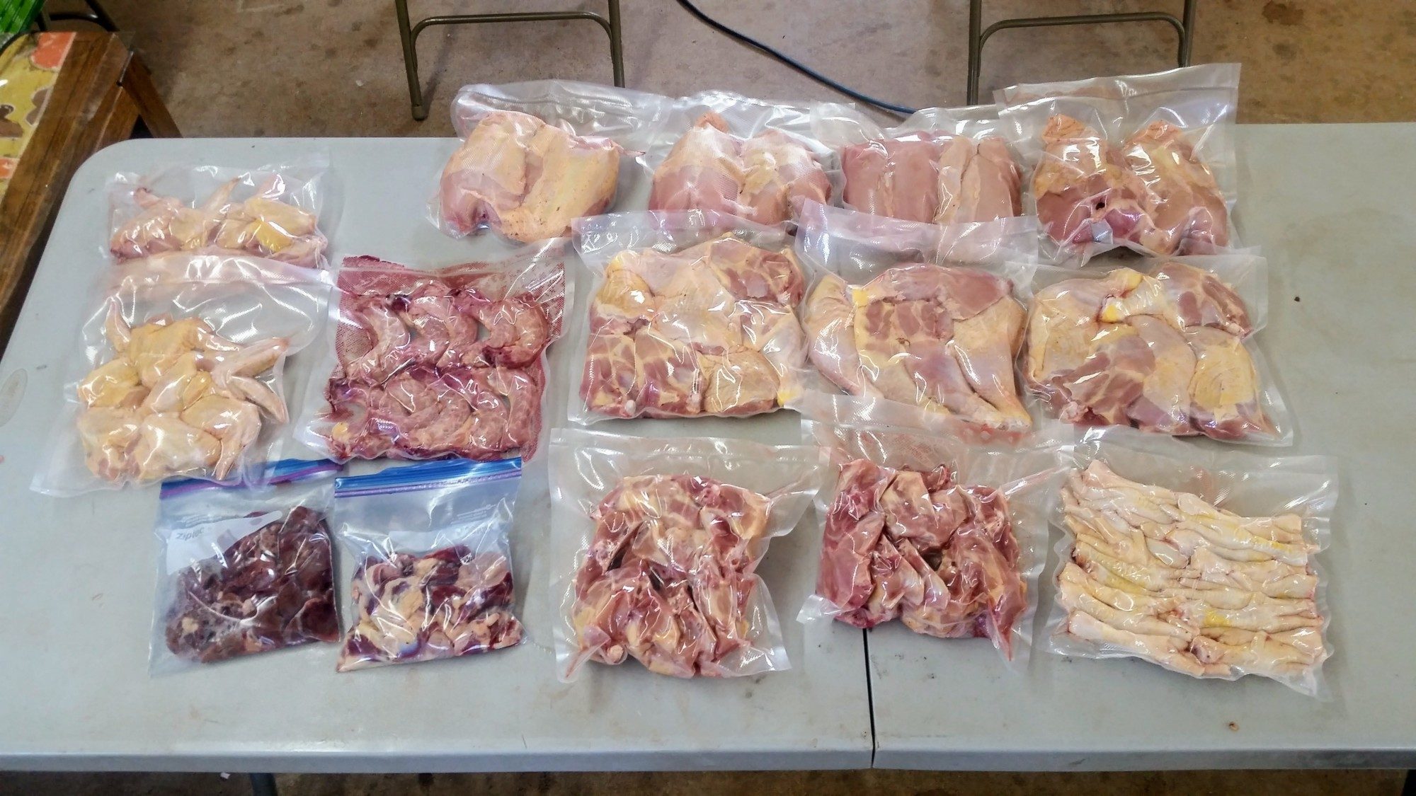 Okay. So I butchered up 10 birds today. Here are the stats. I weighed all the birds after I had cleaned and cut them up. Here is what I got. These weights are on the bone with skin. I used a calibrated postal scale to do this. 1. Breast = 11.72 pounds 2. Leg Quarters = 10.45 pounds 3. Wings = 3.72 pounds 4. Neck and backs = 7.59 pounds 5. Giblets = 1.52 pounds 6. Feet = 1.78 pounds. TOTAL = 36.78 pounds. Without the feet it is exactly 35 pounds. I eat the feet but not everyone does. So if you divide 35 by 10, you get 3.5lbs per bird on average. Okay here are my cost so far. 50 Two week old Cornish X chicks = $20 3 bags of Naturewise Chick Starter Grower 18% @ $16.99 = $50.97 7 bags of Naturewise MeatBird 22% @ $14.99 = $104.93 TOTAL = $175.90 I paid $20 for 50 birds, but have lost four birds along the way so I am down to 46. So if the average weight is 3.5 lbs per bird, then using that average I get 46 X 3.5 = 161 pounds. If I then divide 175.90 by 161, I get = 1.09 cents per pound. The average price for organic whole chicken is around $2.99 per pound, so at $1.09 per pound, I came out way ahead. I made a video of the butchering process for those that have never done this and want to see how it is done. Here is the birds all vacuum sealed up. A well deserved meal of Chicken Curry. Oh Yeah!