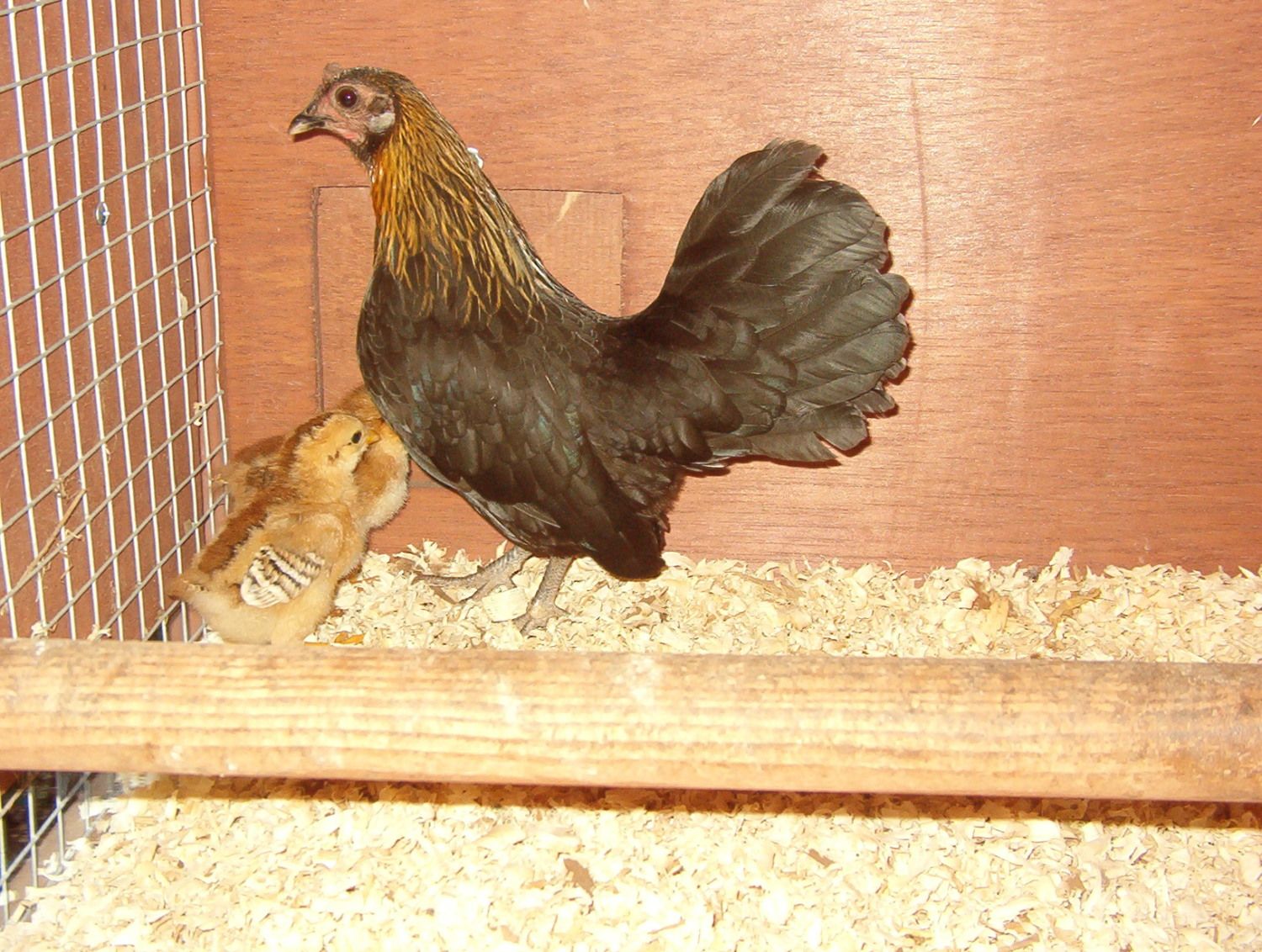 This bantam OEG hen was feral and living in an office park. Employees would throw food to her during lunch. There weren't any backyard chickens around so I am not sure how she got there. A friend asked me to come and catch her as he was afraid she was going to get hit by a car. I found her nest in the central air conditioning unit of the main building. It took several of us to corner and catch her (she can fly well) & I had to make more than one trip as I could not find her roost site. That was in 2007, and I still have her. She hatched & raised several broods for me but best I can tell, she is no longer laying. She is slower & tamer now days too.