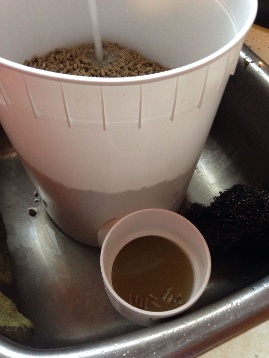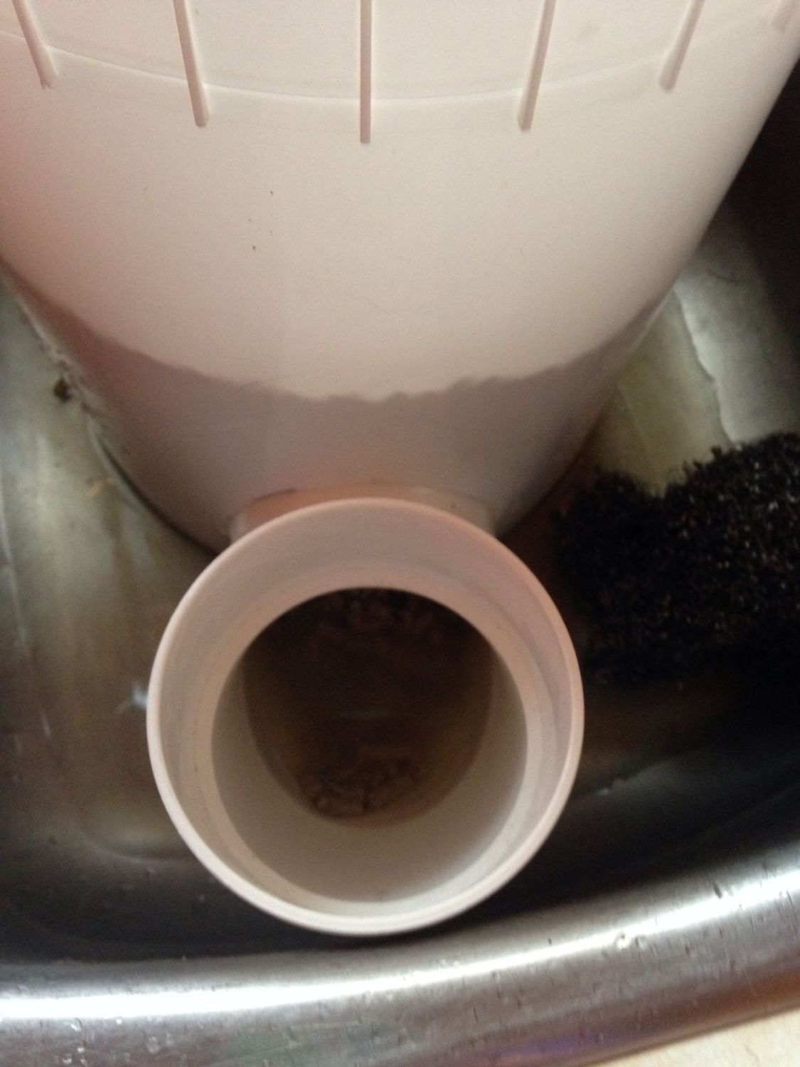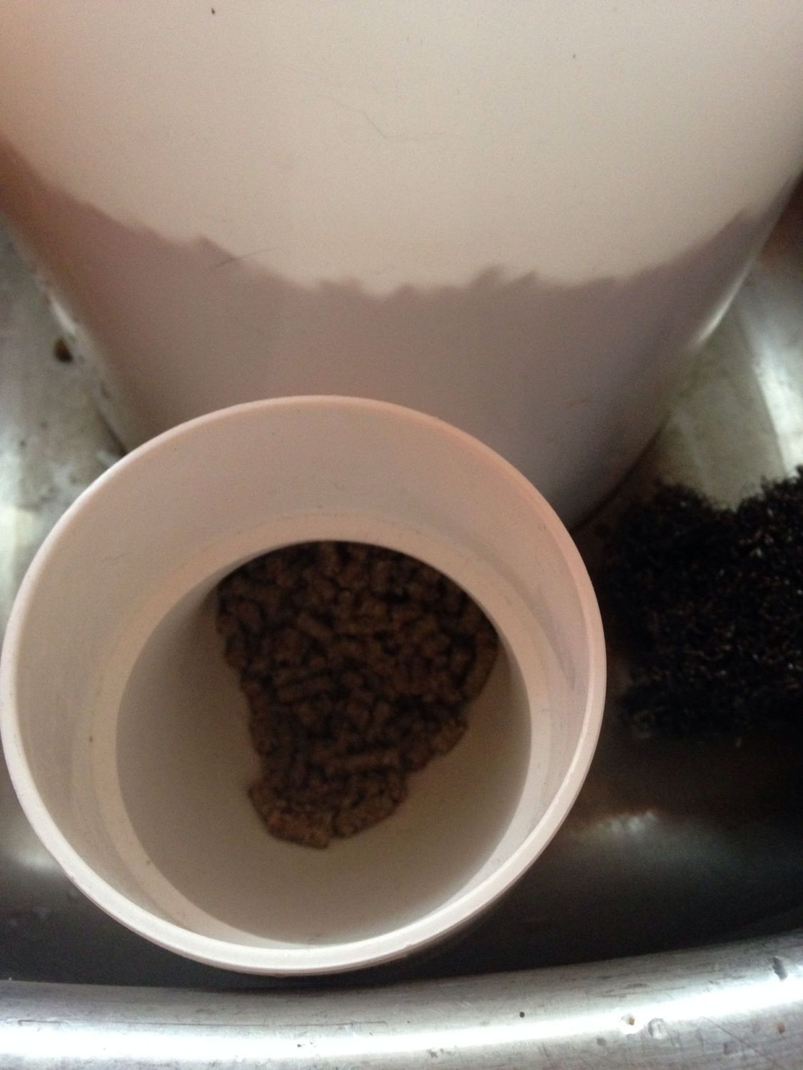 Now I can't literally make FF in the feeder buckets, I make it in another bucket, get it all soft and then I dump it into the feeder buckets... But today I realized if I had an end cap for the PVC piece I could make it right in the bucket in the sink without the water overflowing out the PVC neck... One less step!