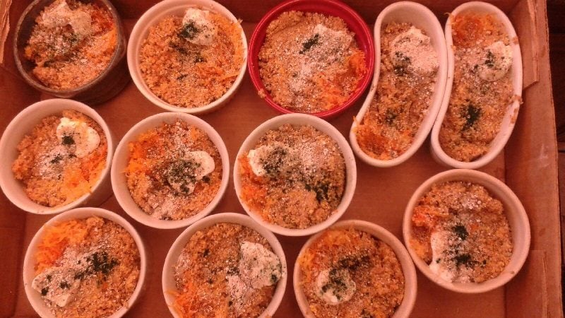 Today's dishes. FF with shredded pumpkin, blended green chili, red pepper flakes, yogurt, chopped kale and oyster/eggshells.