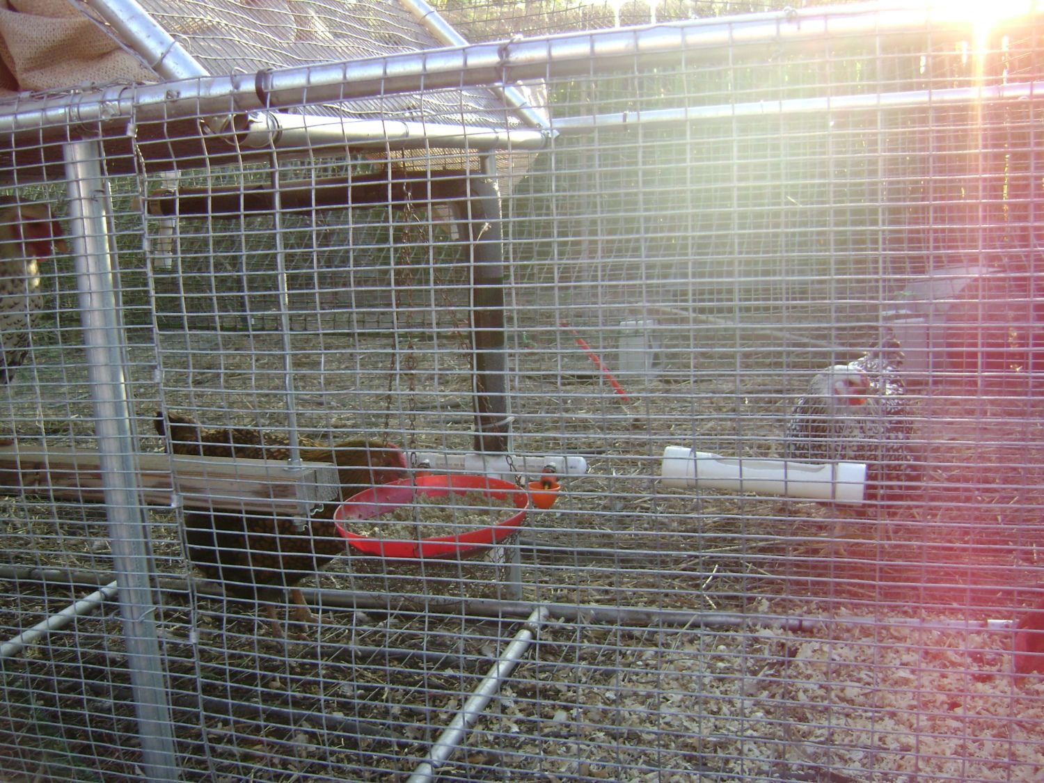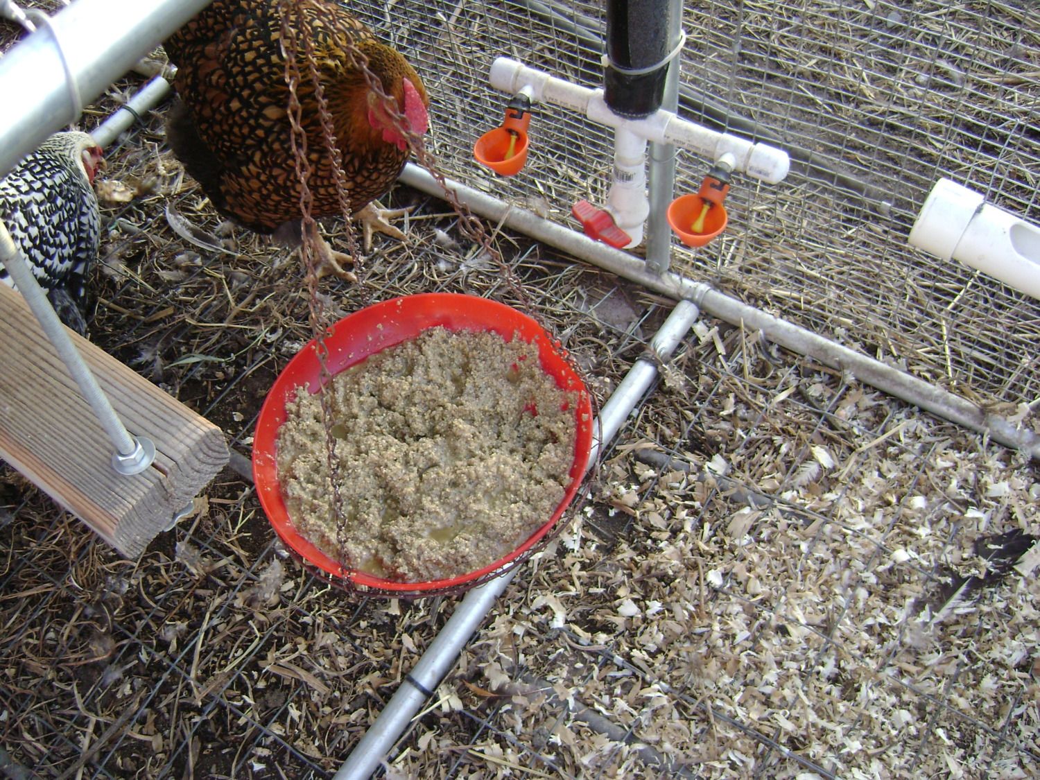 Thanks!  There's a five gallon water cooler on top of the tractor.  I put frozen water bottles in it during hot weather,  the water in the plumbing still gets pretty warm though.  I was using nipples at first but switched to cups because I saw that they seemed to drink a lot more out of a open pan that I had placed in the run during some extreme hot weather, so I figured the cups might be better.  They were using nipples from day one but had no problem with the transition to cups.