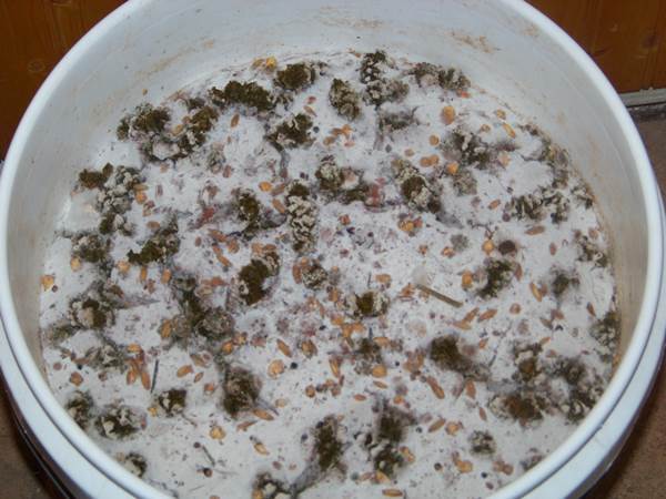 3. Water and commercial feed in a plastic bucket. When it starts getting low (after about 5-6 days) I add more feed and water.