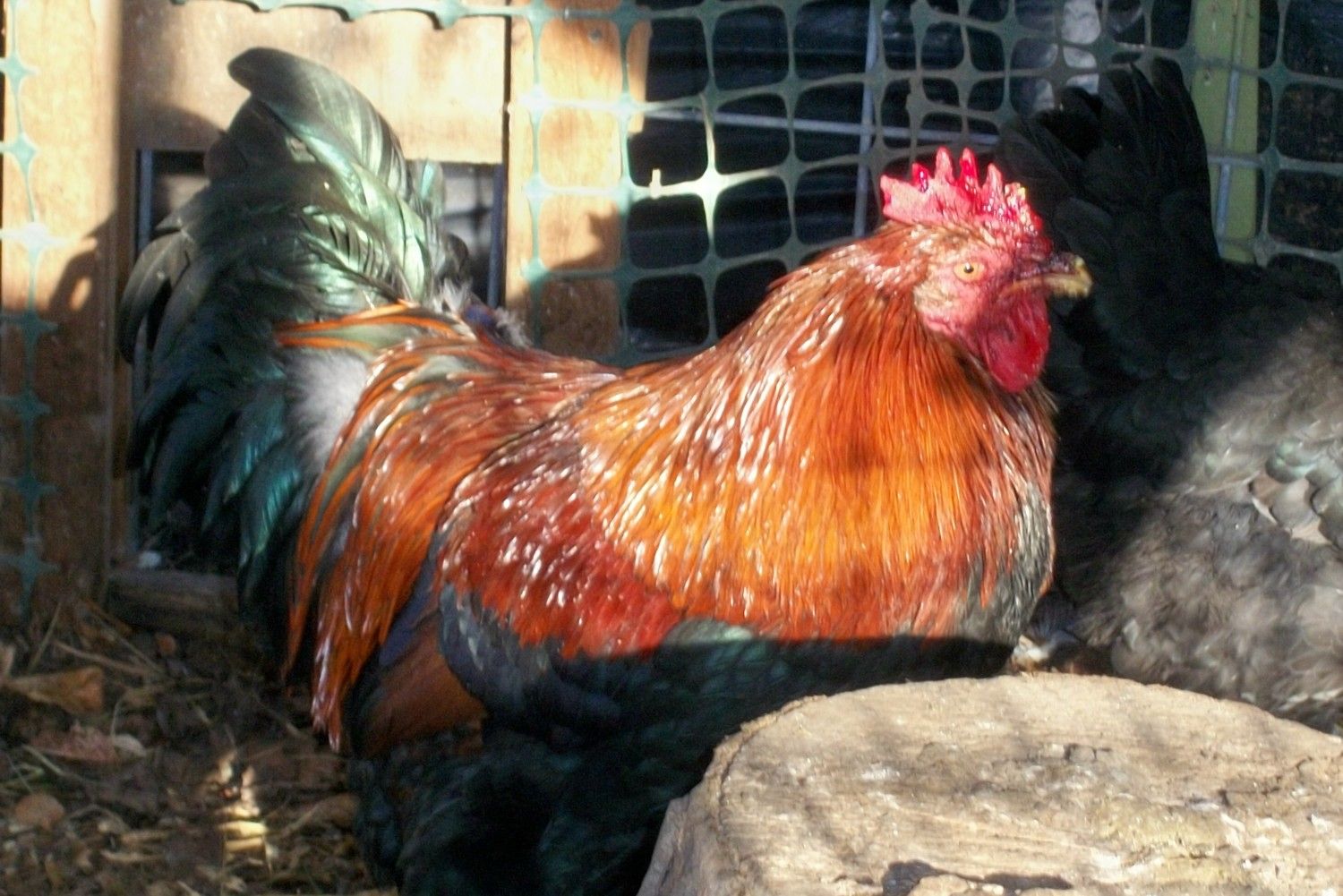 X2!!!! TY, TW! :hugs Here's a few pics of the cheap meats and their pen, as promised. Two of the larger ones were out this morning but went straight back in when I fed, then the pen had to be reinforced where they flew out....with one wing clipped, heavy as lead these boys...flew out over a trellis fence that is 4 1/2 ft. tall. Goes to show you how well wing clipping works...and they had the primaries and secondaries cut! This pen is odd shaped and approx. 5x8x10x8 with a height of (now) 6 ft. on 3 1/2 sides of the pen. Will share more pics when I get them uploaded..I'm in the middle of deboning a turkey! Mr. Hobbled Rooster got his hobbles cut today and he feels like a new man...er..chicken. I've thrown them several apples to work on and a good bit of BOSS in their bedding to give them something to do in their penned existence. It can't be easy to be confined. Fat Cochin....he's one big eater..heavy guy. Several of the larger roosters are extremely heavy, meat dense. They've eaten all they can and are trying to grab the spot of sun coming into the pen for a morning sun bath. Post-breakfast daze of full crops and warm sun.... And ol' Toby...who had another fight with the new boys this morning and looks like he lost this time....he's staying in the coop now and letting his battle wounds heal. I think he lost one of his points in this last battle...the last one looks nipped off. Poor old guy is trying to keep his throne against a whole pen of usurpers..it can't be easy.