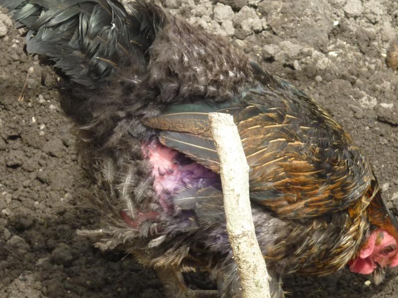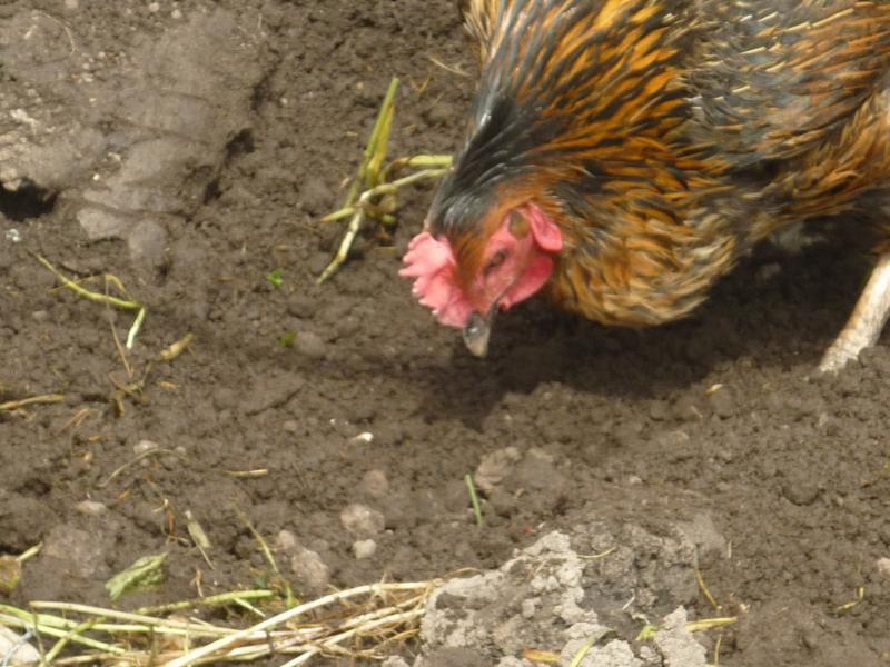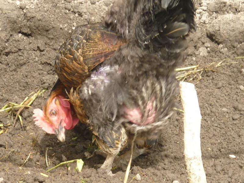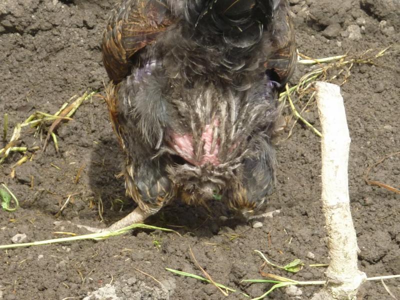 These are the only photos I could take without them being in deep vegetation. She is a black rock laying hen and she started laying in November - only missed two days since! I have no lights etc in the coop as I do not believe in forcing them to lay if they decide they cannot. The feathers on her back that were plucked out have not yet regrown - but she still has the soft downy feathers so she is not bare. The skin shows no sign of being sore.