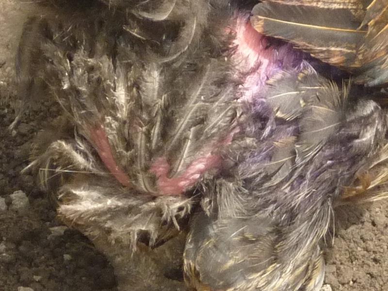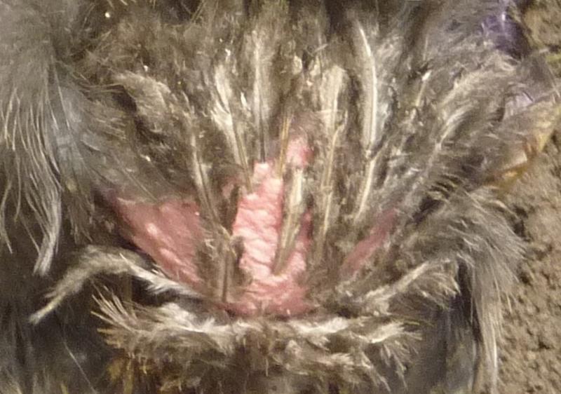 This is/was the hole under her wing - you can see where her back feathers were plucked out by the feather eater just leaving the small 'under feathers' in place.