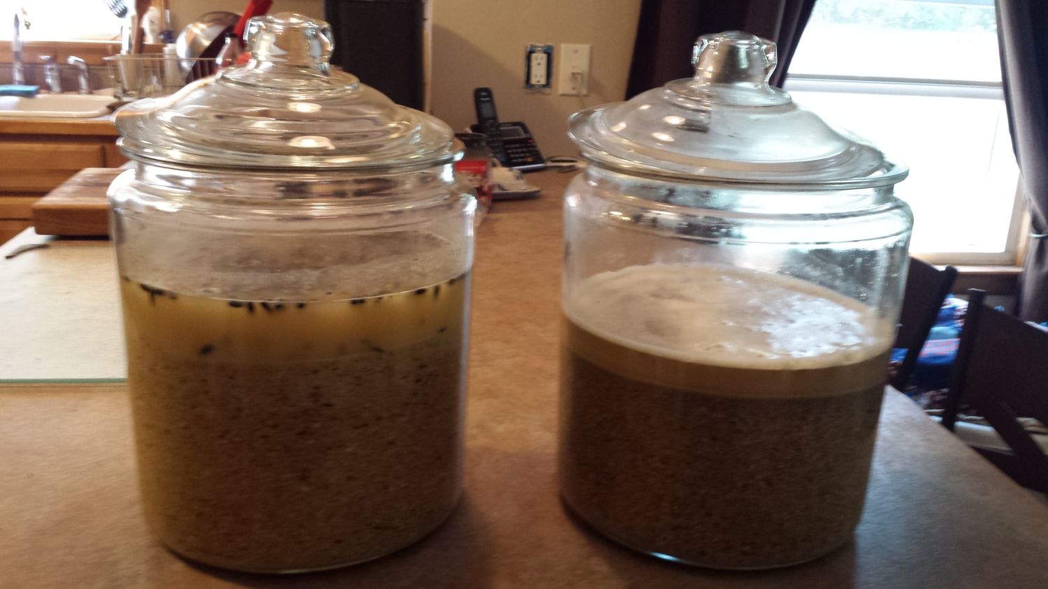 I did start another jar of it without the BOSS and I won't touch it for 4 days. The amount of feed I put in the jars was 1 cup dry per Bird, so I think that should last 2 days. I have more room in my container, so I think I will add more the next go around. Here are my 2 jars. The left is what I started on Friday night and there other was from this morning. How is it looking?