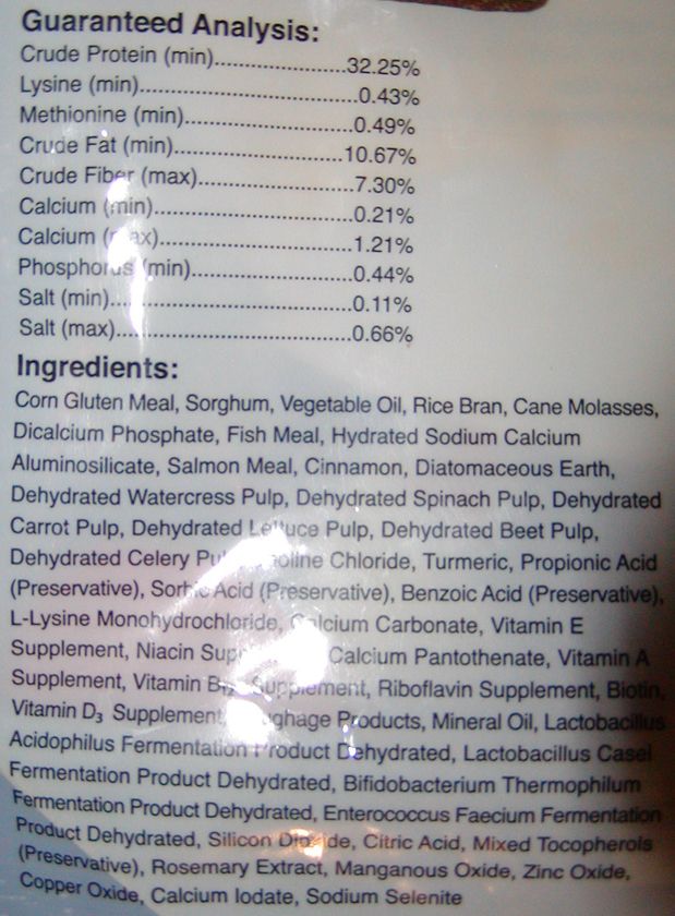 Ingredients: Corn Gluten Meal, Sorghum, Vegetable Oil, Rice Bran, Cane Molasses, Dicalcium Phosphate, Fish Meal, Hydrated Sodium Calcium Aluminosilicate, Salmon Meal, Cinnamon, Diatomaceous Earth, Dehydrated Watercress Pulp, Dehydrated Spinach Pulp, Etc.