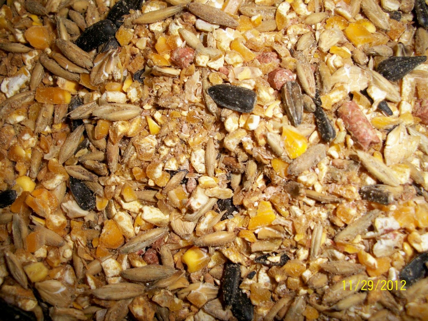 The birds will be more inactive in the winter and burn less fuel due to this, so more can be used for their production needs. It all balances out in the end. The BOSS also gives them a little variety and you will see them scarf them down first...they LOVA dem some BOSS!This pic shows the mix I had last fall...ignore the red pellets in it as they are not my usual. I had added some calf manna to get some sick, anemic birds some quick fat before winter (see Road Less Traveled thread) but it was just a bit and only for a few weeks. Even with that it was WAY too much and the birds got too fat, too quick so I had cut them back on feed a little to correct my mistake. That's the only time I've ever used calf manna for chickens, so don't think that is a normal thing...I've never had to recondition old and sick birds before winter before, so it was a quick fix. Have to be careful with that stuff..it is WAY to rich to use on a regular basis.![]()