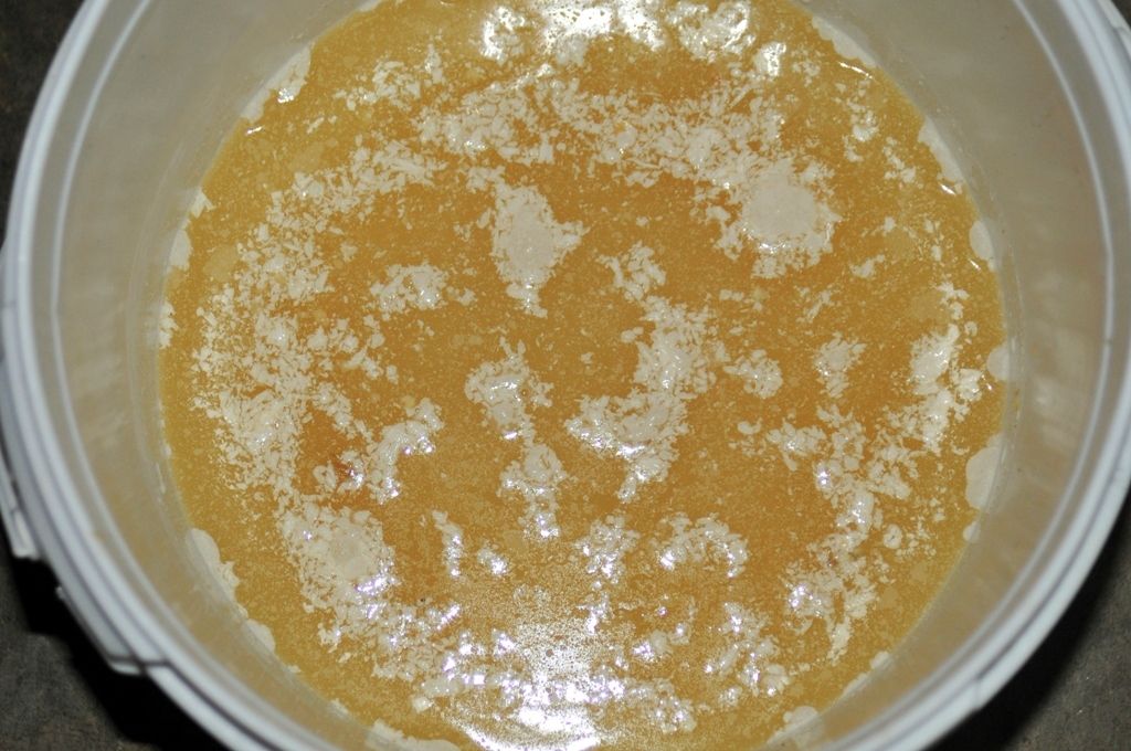 Every time I do my morning FF I use a strainer (see page 83) to pour in my daily amount. The fermenter that I pour from is set aside till the FF in the strainer is drained, I then take the fermenter that I poured from and empty the rest of the mash into the fermenter in which the liquid from the strainer had drained. I swirl the remaining mash with water till it is all lose from the fermenter bottom and pour that into the fermenter into which I had drained the mash in the strainer. My mash ferments for 36 hours and believe me it has a wicked smell to it by then but that doesn't seem to bother the chickens.I have a packet of vitamins and electrolytes to mix in water and when I do, it turns it orange.