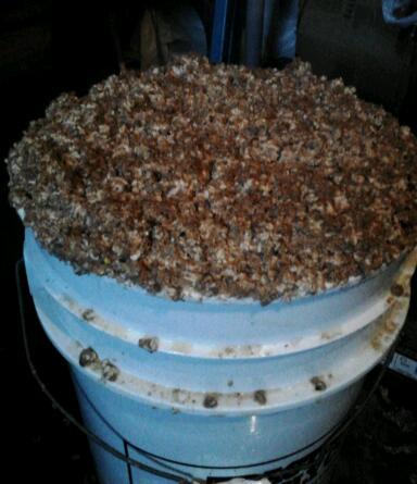 I hope all the new folks starting fermented feed learn quicker than I do. Every time I do this I think to myself how I won't do that again! There was at least 6" space left at the top of the bucket but not enough! Note to self ...again, "DO NOT FILL YOUR BUCKET TOO FULL OR IT WILL OVERFLOW WHEN THE FEED SOAKS UP THE WATER AND THE FERMENT STARTS WORKING!"