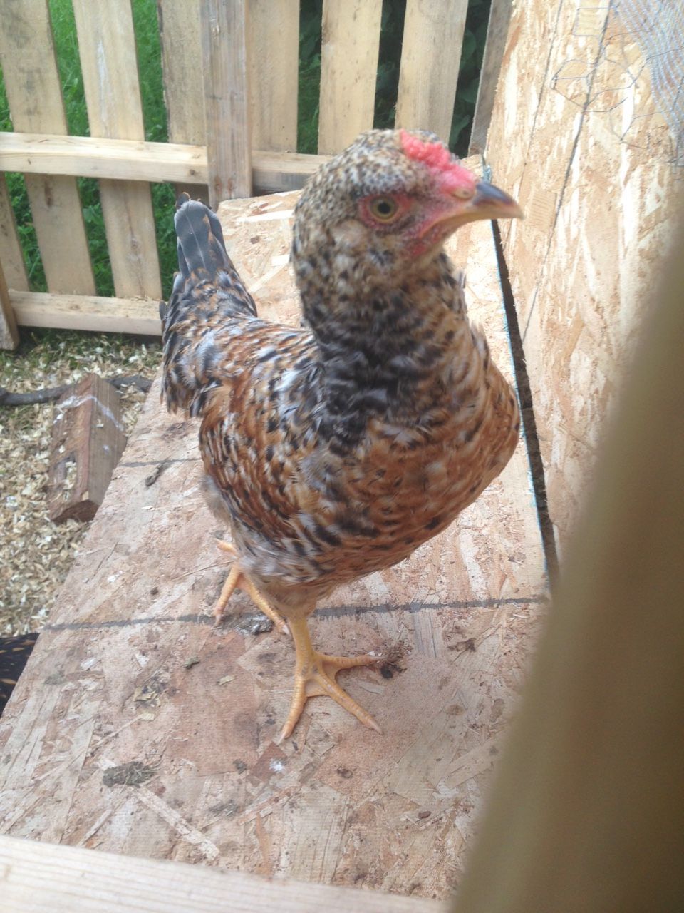 She was one of six same aged chicks, and her crown is like 1/10th as developed as theirs is and she doesn't have any wattles while they had full wattles. To my untrained eye, it looks like a single pea comb but I'm not sure because it's zigzaggy. I believe she is an easter egger mix. Her crown is reddish, but I know that is not a definite on gender - and all my pullets have had reddish/pink crowns except my newest two so I don't hold much weight in that as a single indicator. I'm hoping some of you, with your experience, can help me to determine whether she's a cockerel or pullet so I can decide whether to rehome her or keep her.