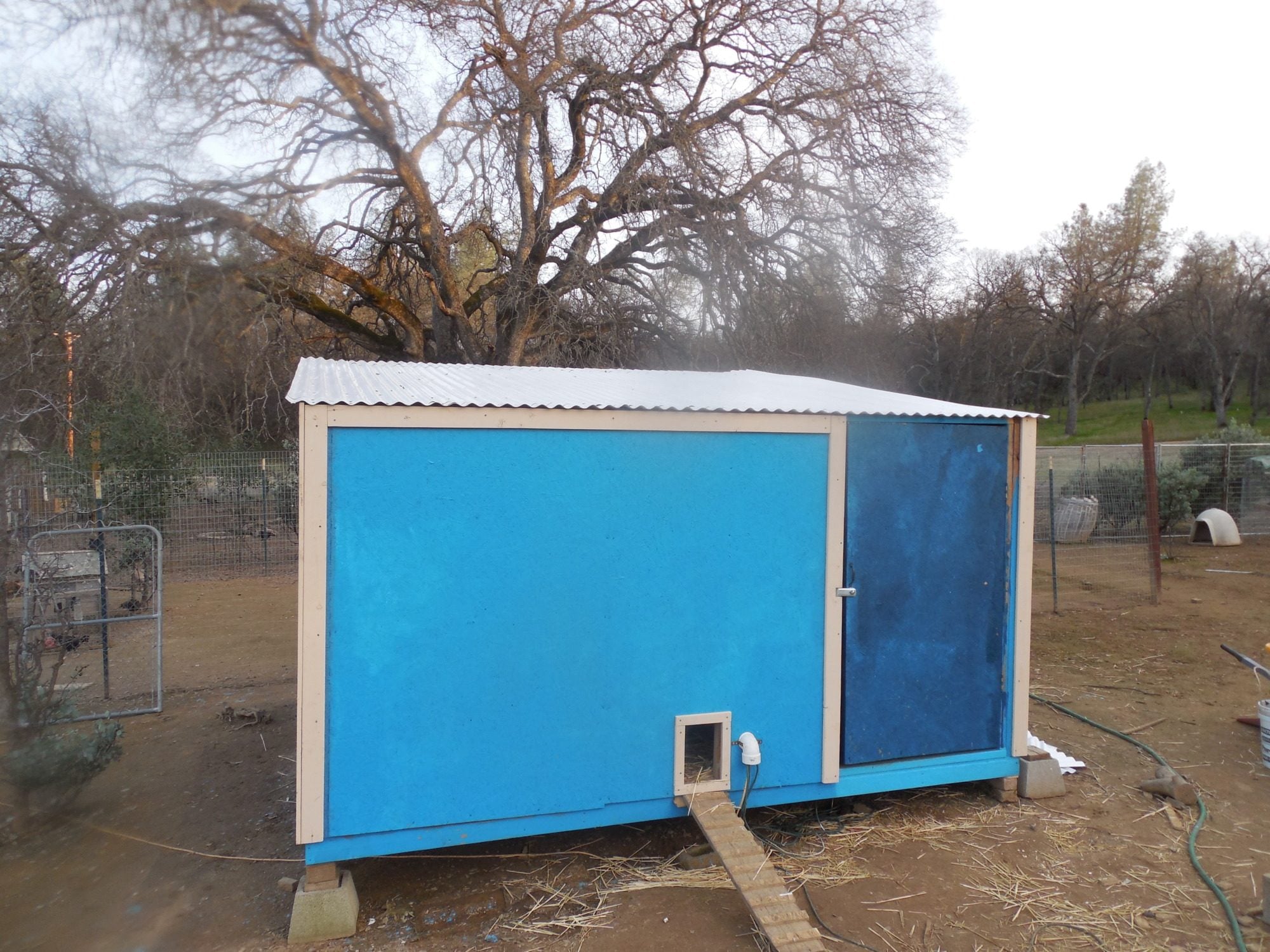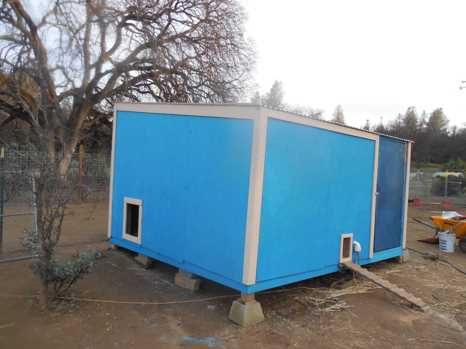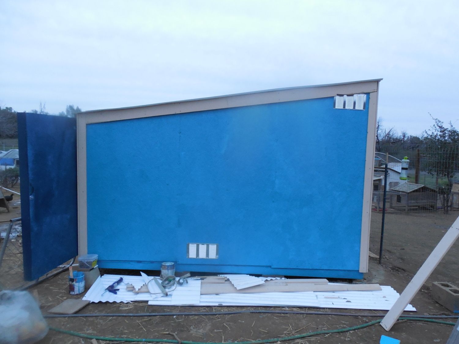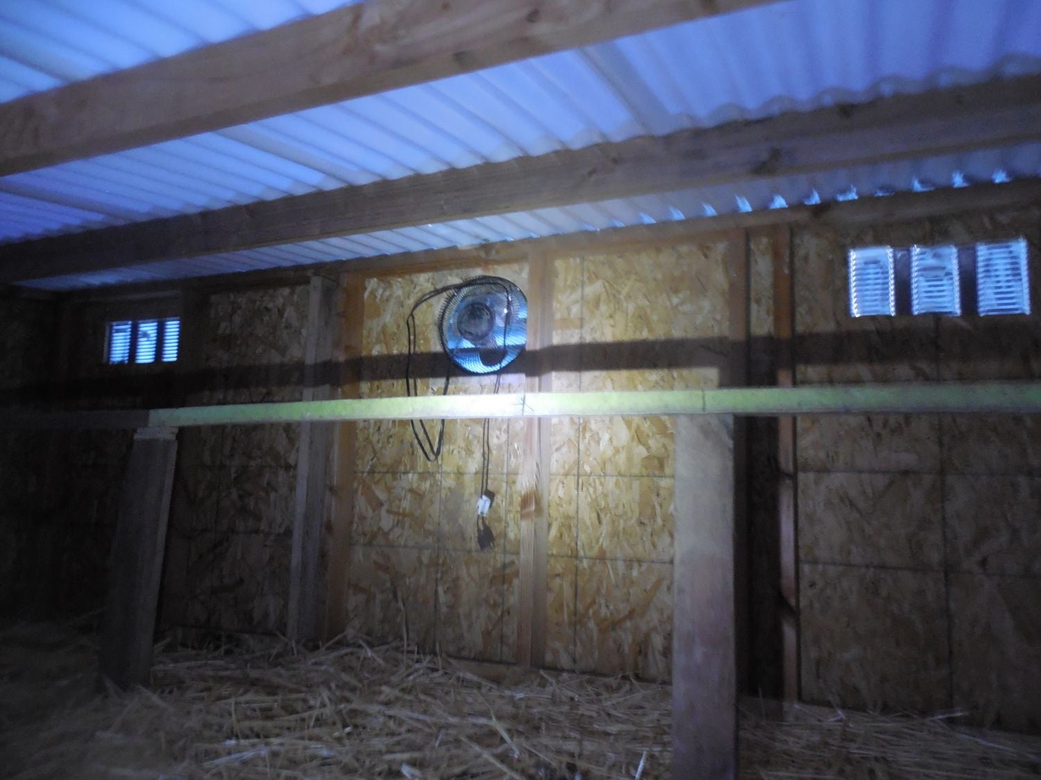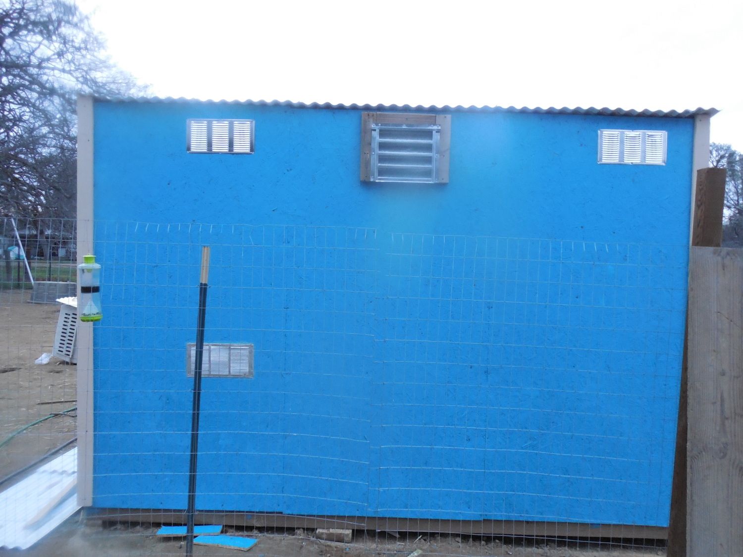 Don't worry, I am adding more tomorrow but there is a lot of ventilation already. The roost floors don't go to the wall so all the air coming in from the dog door gets circulated throughout the entire coop also the chicken door is open and the corrugated plastic isn't sealed so all those open grooves are venting air from the 6ft from to the 8ft backWhere you are, you are going to need lots more ventilation. Lack of ventilation will make the coop way too warm in the summer, and way too damp in the winter. Without enough ventilation, frostbite and respiratory illness will be problems.