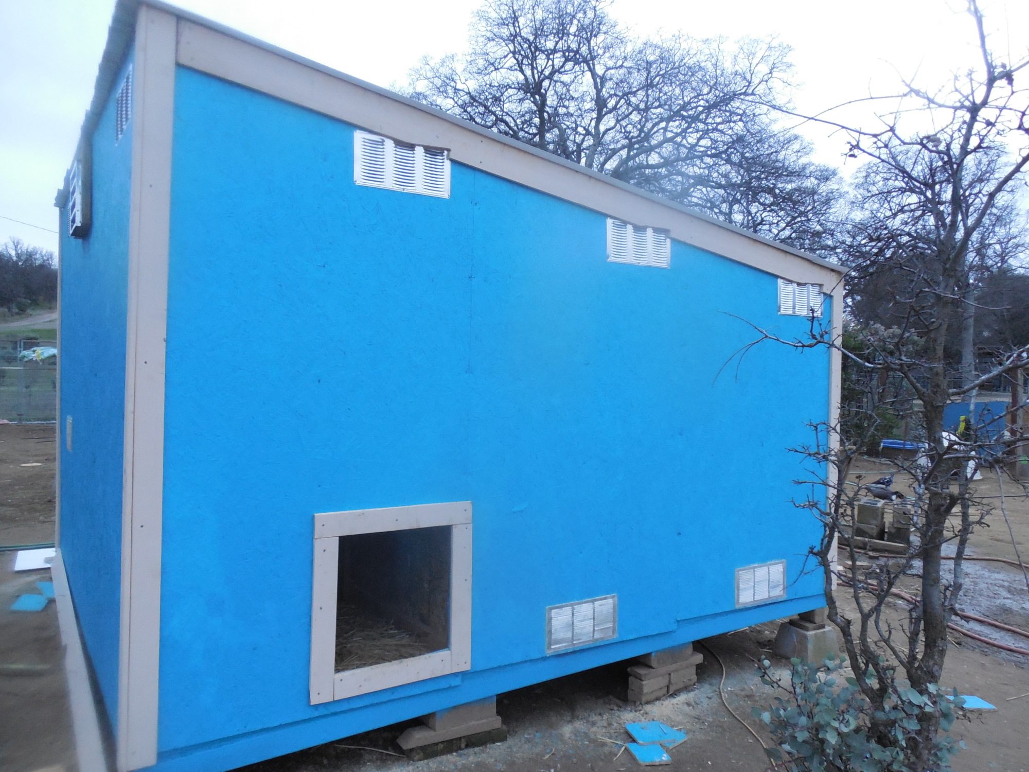 GOOD GRIEF!!! Did you miss the two other posts where I said I was going to work on the ventilation today? Which is what I was doing today and will continue tomorrow. I just wanted to show the basic finished coop. But let me explain what ventilation it already has since it seems there are some serious ventilation panicking Nazi's here. On the walls behind the back of the roost area there is a 3.5 inch gap that runs the length of the back wall (So that's 12 ft x 3.5 inches) which allows fresh air from the 20" x 20" dog door to circulate through the coop and exit out through the spaces of the corrugated plastic roofing which is above the roost at the highest part of the coop. I put vents in the medical bays today which also has a 3.5 inch gap running 12 ft wall. It's not a ton of ventilation but I think it is enough for the small number of birds I'm housing in it currently. And let me say again again that I was working on the ventilation today and will continue to work on it tomorrow which is when I will finish the ventilation part but still have some finishing touches like finishing the ventilation, eves over the dog and chicken doors and nest boxes. So let me say it once more, the ventilation is being worked on and I'll post proof pics tomorrow.The thing is, ammonia and moisture rise, so in order for ventilation to be effective, it needs to up above roosting height. If the ventilation isn't clearly visible from all those pictures, you don't have enough.
