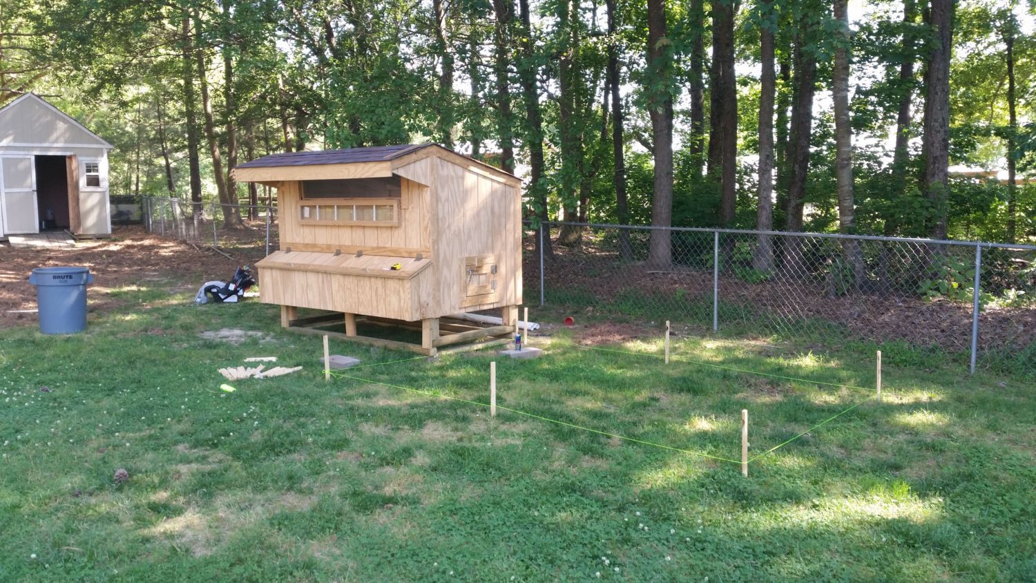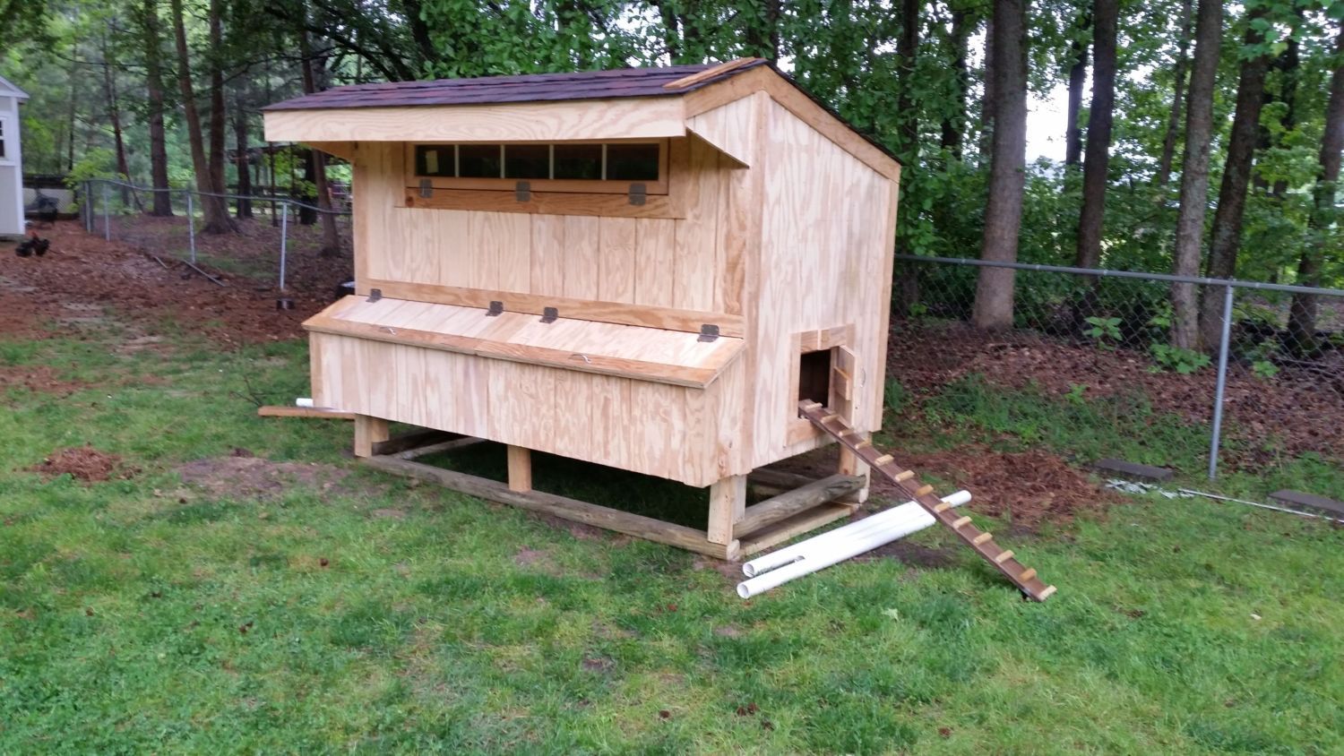 We purchased a pre-built one from Craigslist since I am not great at carpentry, plus I don't have the necessary tools to properly build one. Anyway, they refused to drive through our backyard (after I said I didn't really care) so we had to use our van and PVC pipe to pull the coop onto the foundation I had built.
