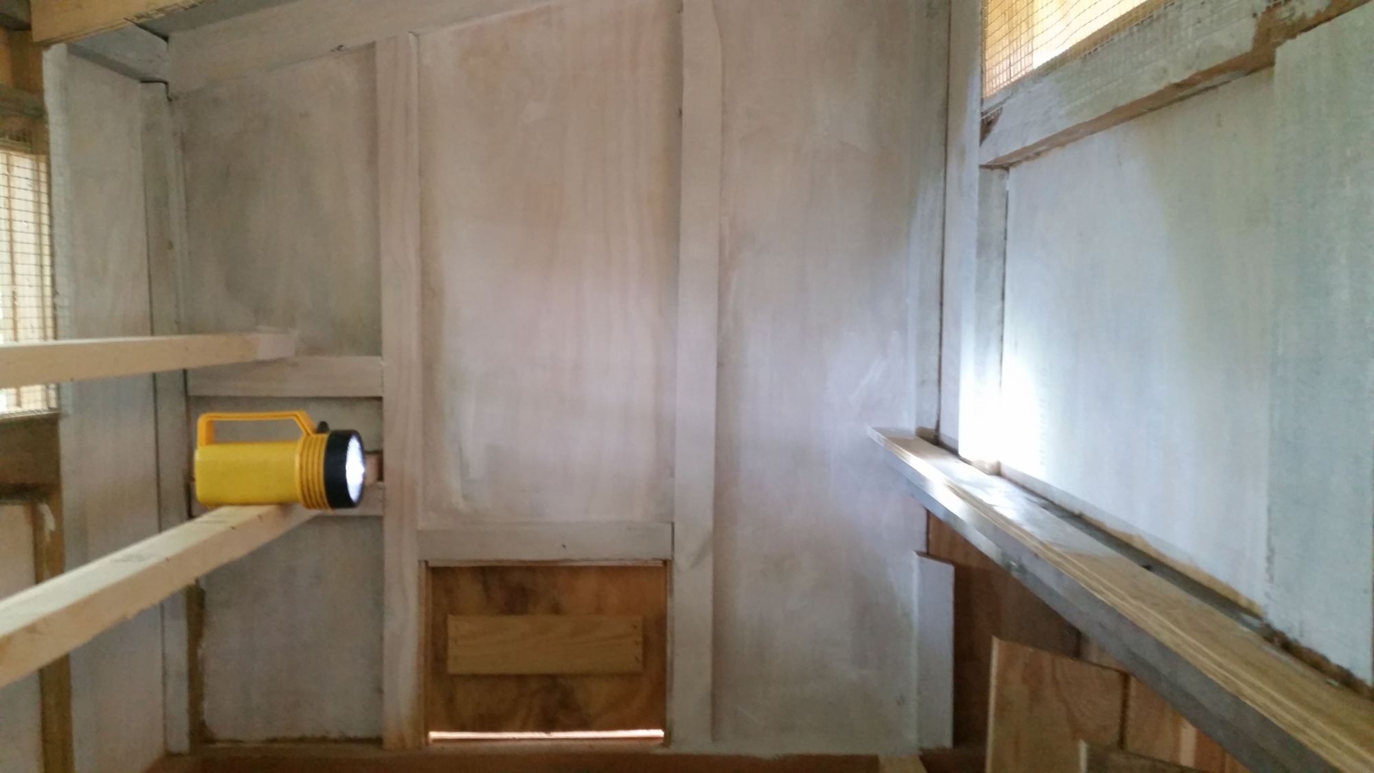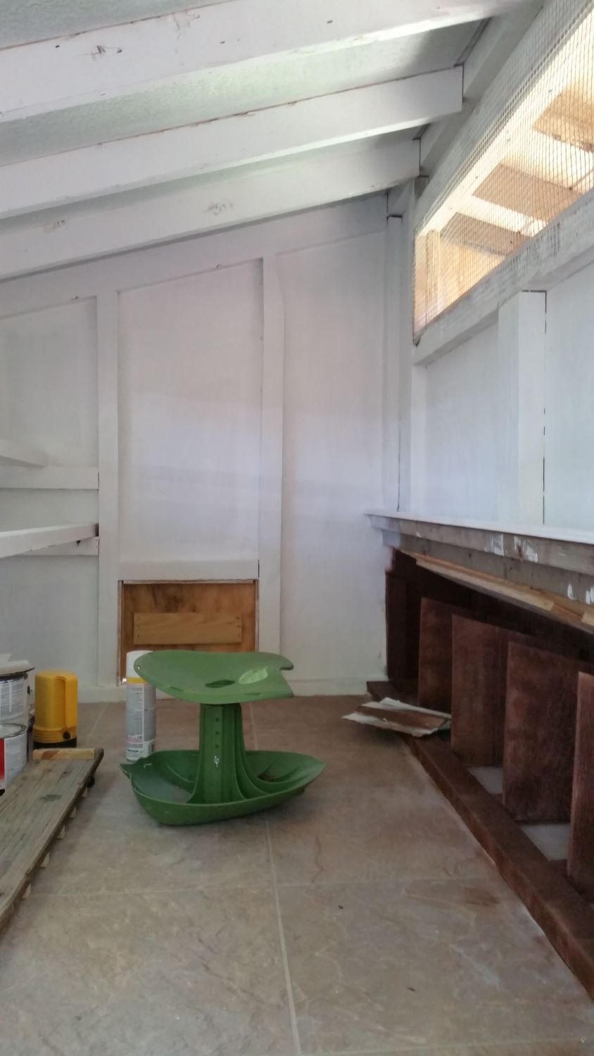 Painting the interior first. I laid one coat of Kilz primer down first on all the walls, and in the nesting boxes. I then put a single coat of high gloss white on the walls and I picked a simple flat brown for the nesting box areas cause I read it's good to keep that area dark for the girls to go and feel comfortable in.