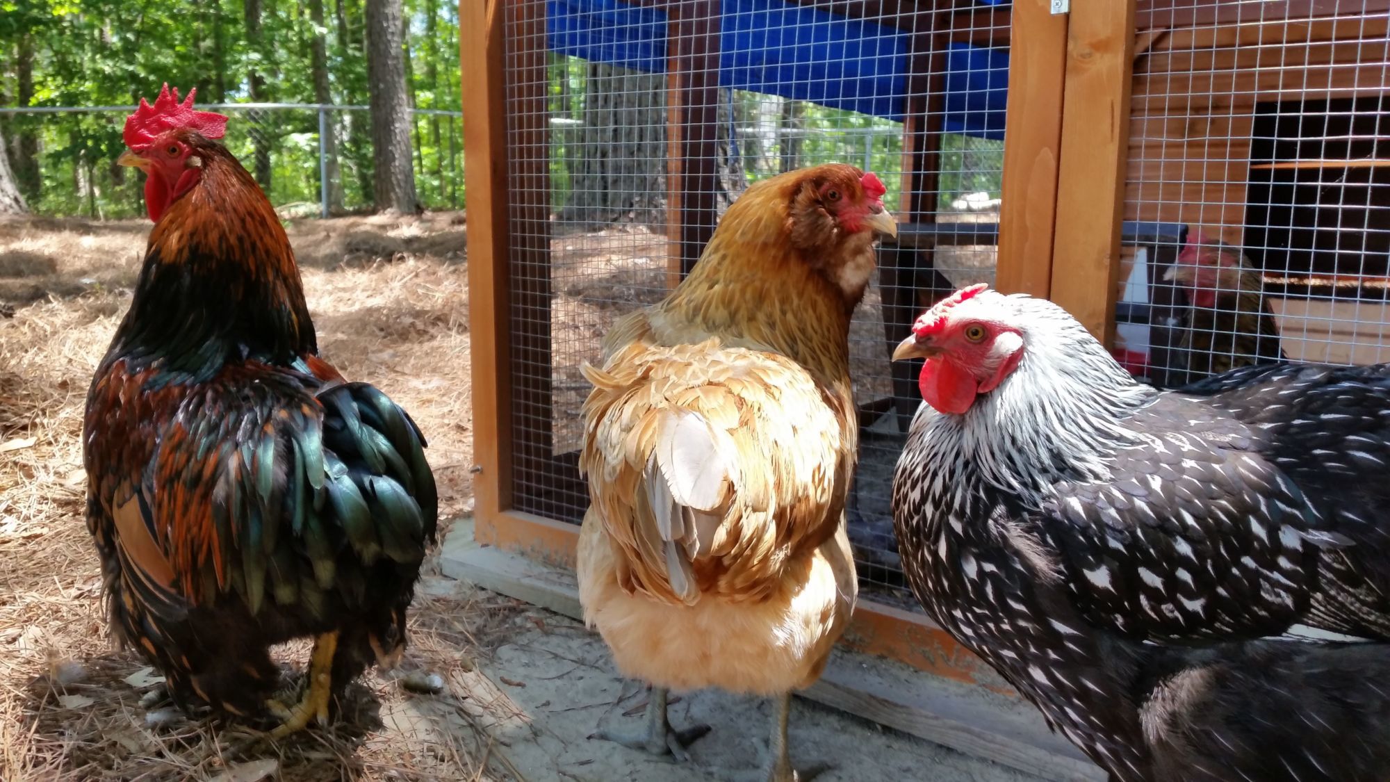 And here's the gang. We have Lola (our Gold Laced Cochin Bantam) in a separate coop cause the others are picking on her... her back had almost no feathers. I'm curious how I'll be able to reintroduce her without her looking tore up within a day again.