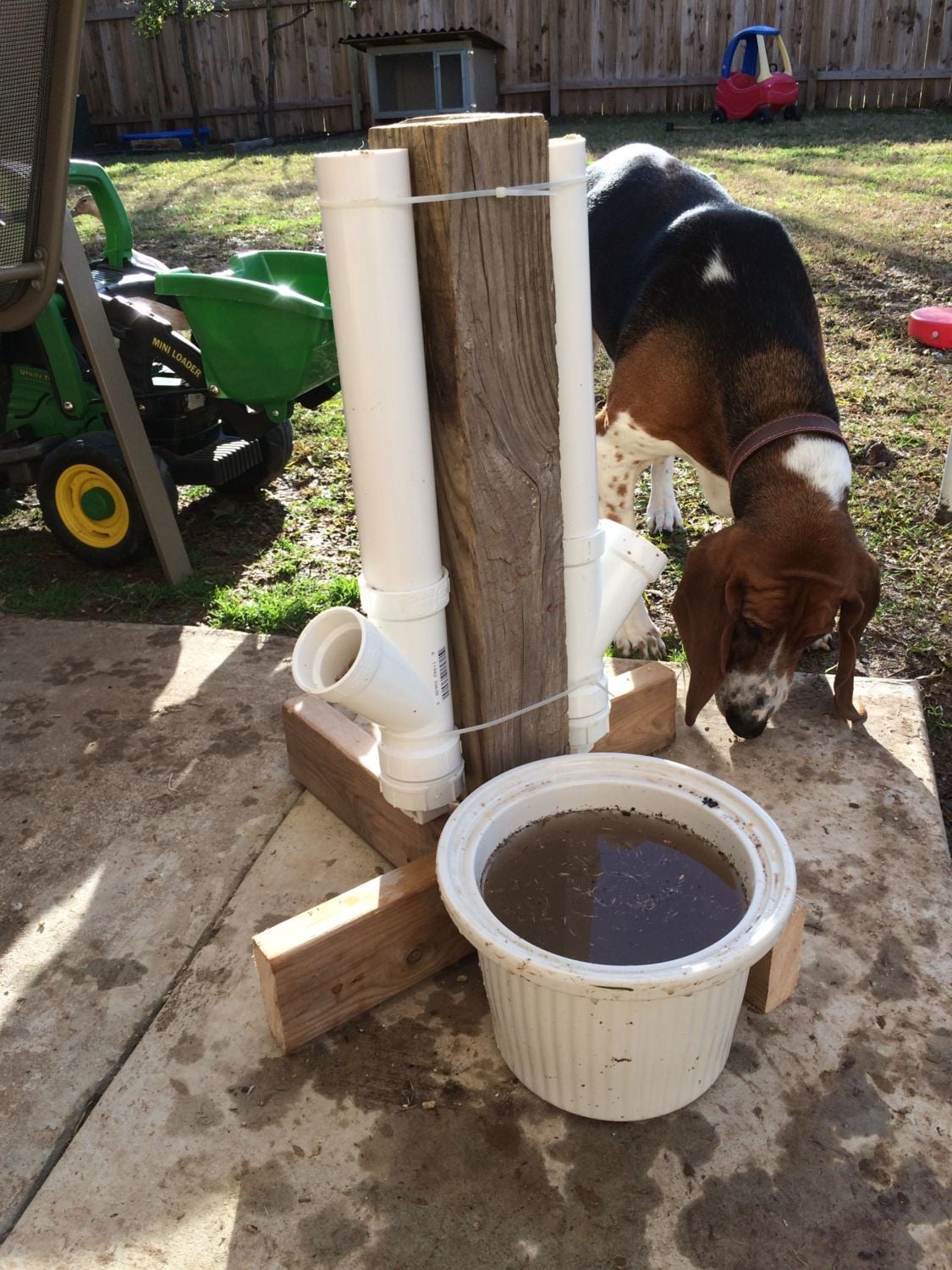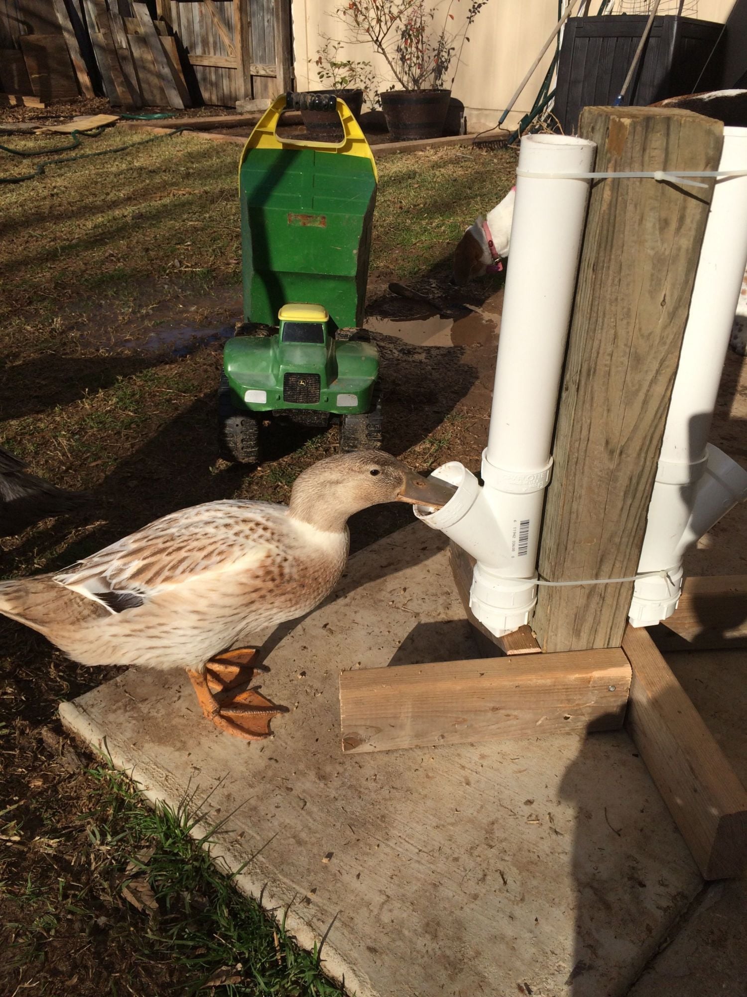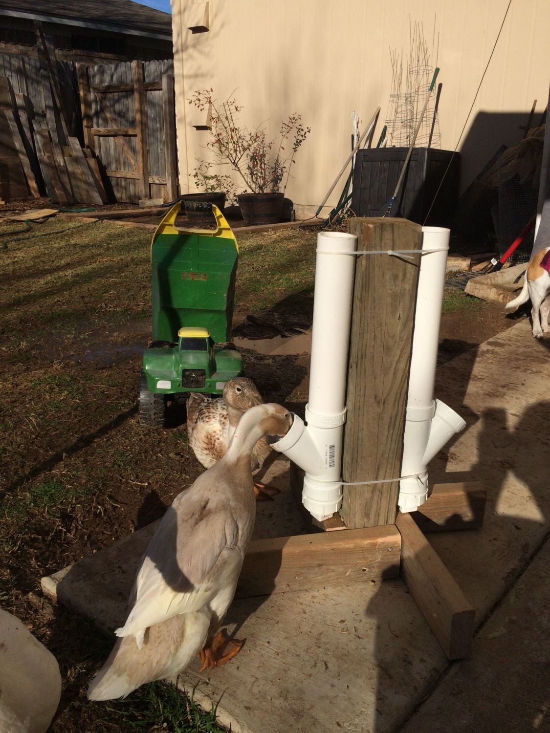my hope was that my dogs would not be able to get the duck food out. Ha! I should of known better but it does work out great and my ducks have zero problems getting the food out. I also picked up a crockpot insert from goodwill for their water. It's too heavy to flip and while I know they could get in it if they wanted they don't.