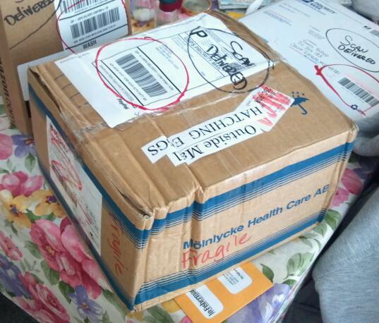 Hand clerk the box and say, "These are fertile hatching eggs". Clerk checks in the box, then picks it up and smacks it down on the counter as she says, "Okay". She was just signifying our transaction was finished and the smack was a physical exclamation mark to the end of her sentence.