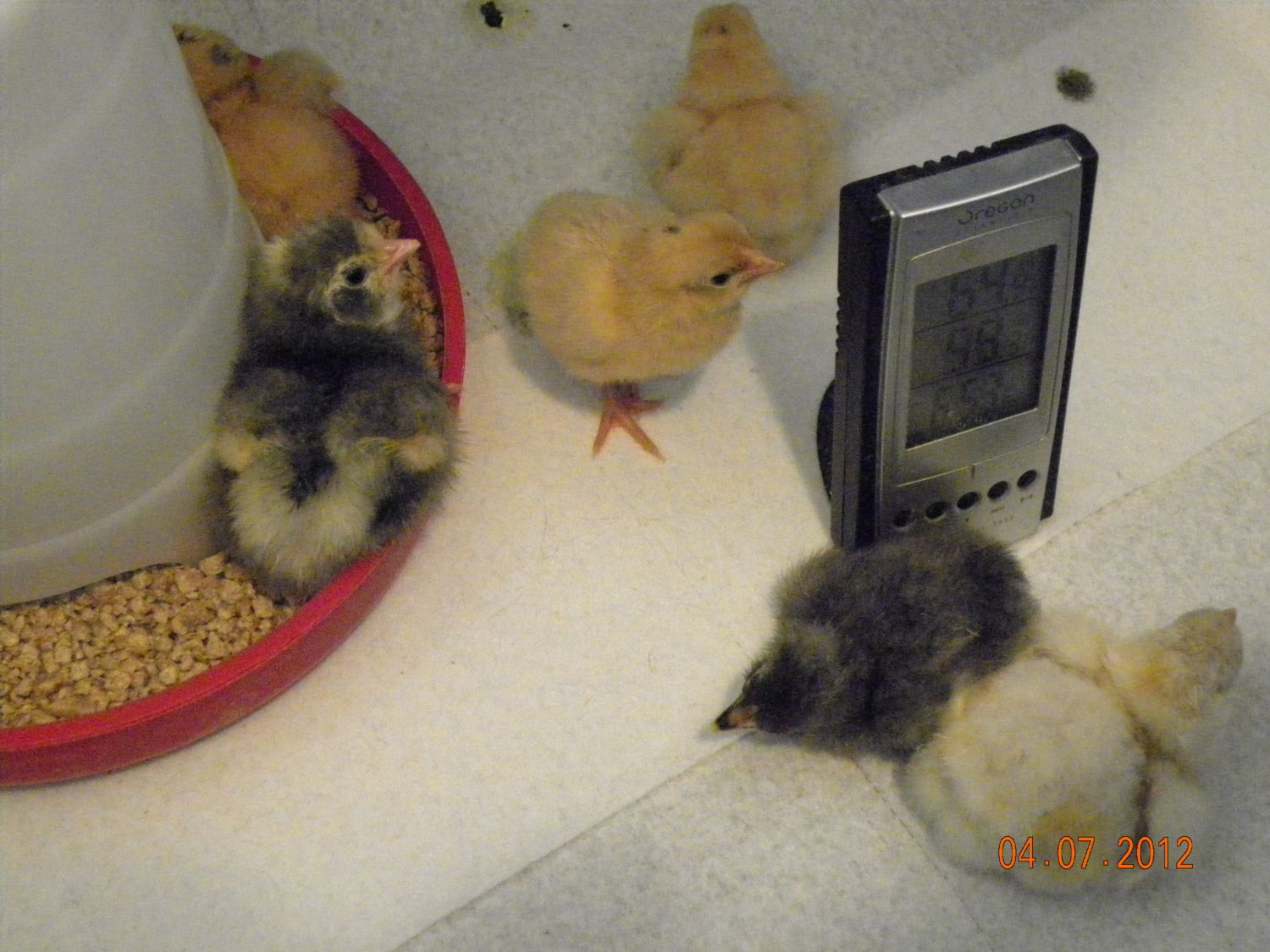 These are the chicks I hatched for Easter, and the front three are my Araucanas from Ray-n-Debi. I didn't have as good a hatch as I would have liked, but at least I ended up with six adorable little chicks (and maybe 1 pheasant). The one in the front right corner is sitting in my lap right now, and I've named her Easter Buddy. (This was my BUD egg, Debi.