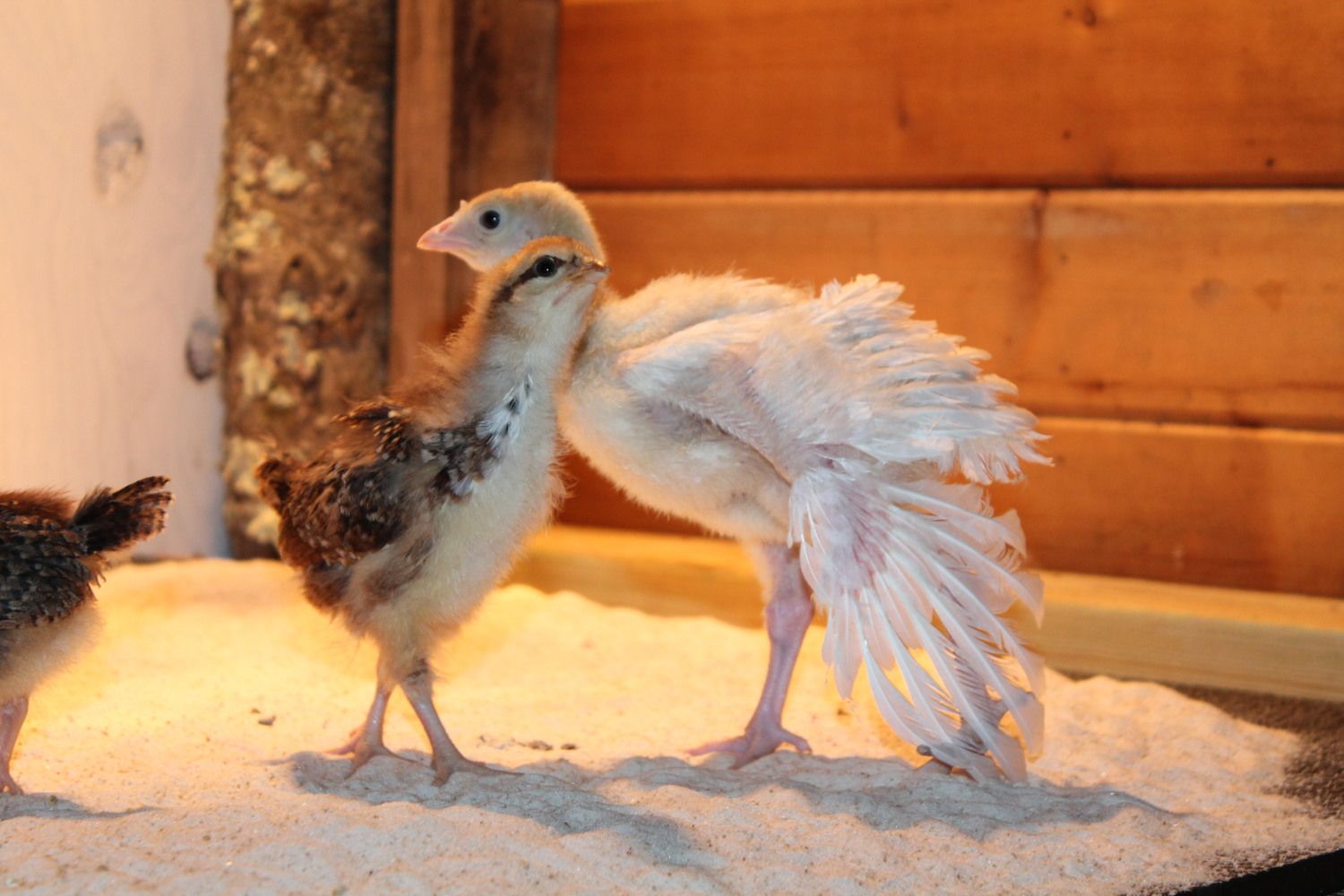 3/26 In the run attached to the outside coop (breed Q about both in the foreground in front of the turk)