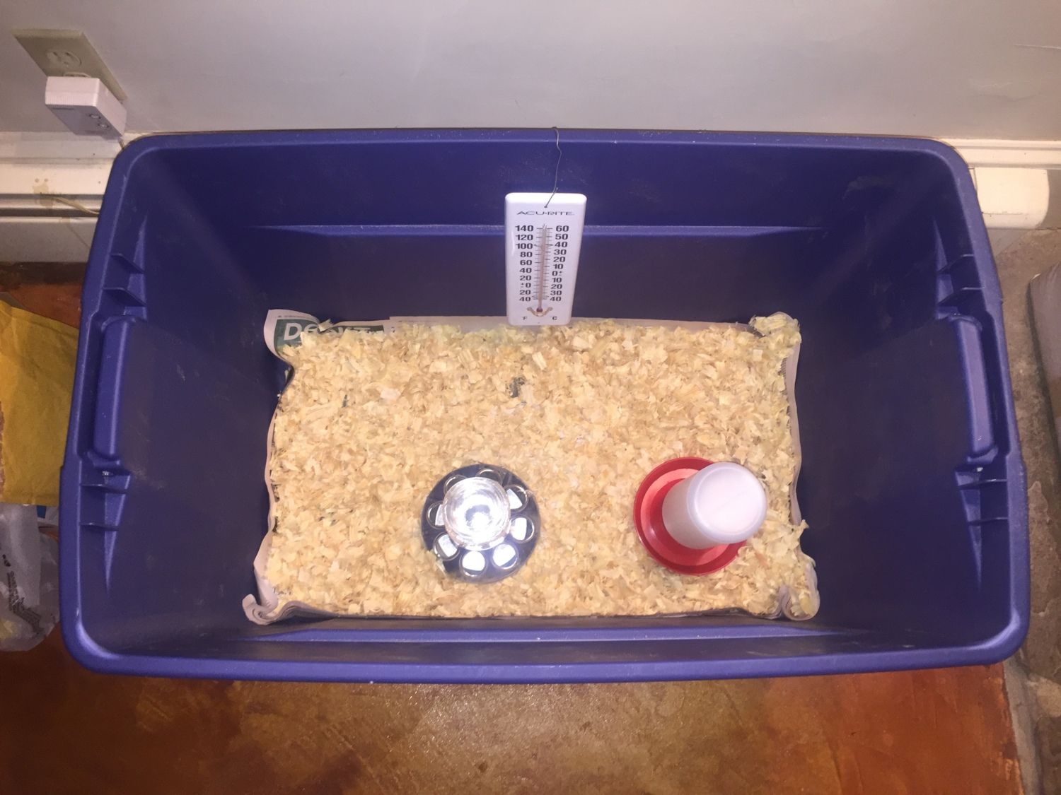 I was going to place this in the garage, to keep it in a place where my young kids could visit and handle the chicks, such that they develop a nice disposition. However, we're afraid my (very loud) car will scare them half to death every time I start it, so I have moved it to the basement of our house. Now, looking at it all set up with a heat lamp atop a bin full of newspaper and wood shavings, it looks too much like kindling to allow it in the house. So, it will be moved to my (heated and air conditioned) barn. This means less opportunity for the kids to interact (it won't be right in the house with them), but better peace of mind for my family sleeping at night.