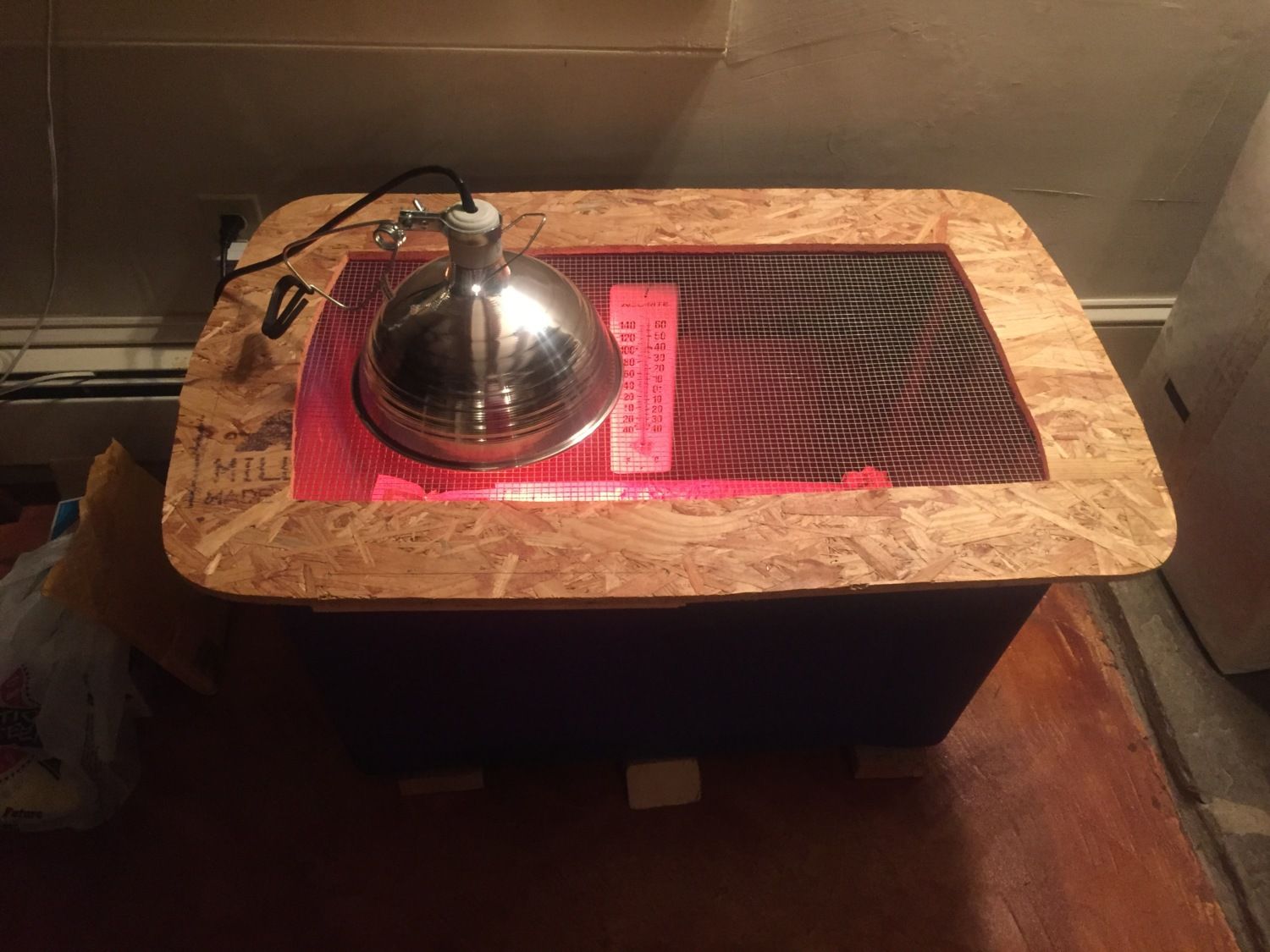 Lamp was tested with several different bulbs and locations, but it seems the best way to hit 95F average in the tub is to just place the lamp right on the chicken wire toward one end. Directly under lamp is about 100F, but the far end of the tub is only 85F, so it seems to give them the option of being warmer or cooler, by moving around the tub.