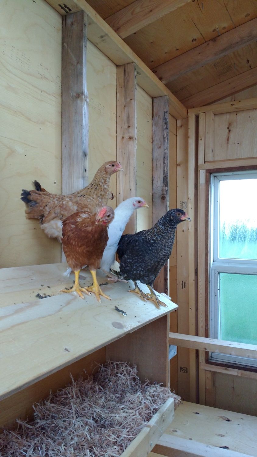 While waiting almost two months last Sunday I finally got to bring home my chickens! It took that long to build the coop while both my husband and I worked full time jobs. They are settling in well. I love coming home and having them run outside or over to their fence when I get home from work. Their personalities are really starting to come out too. The one at the front, Henrietta, seems to have the strongest personality. She follows me around, attempts to peck at my toes and is the first one to find a loose string or hoody rope on my clothes. The black one is Cora, the white one is Mabel and the lighter brown one Gertrude. I'm so happy I finally have them! Can anyone tell me what kind they are?