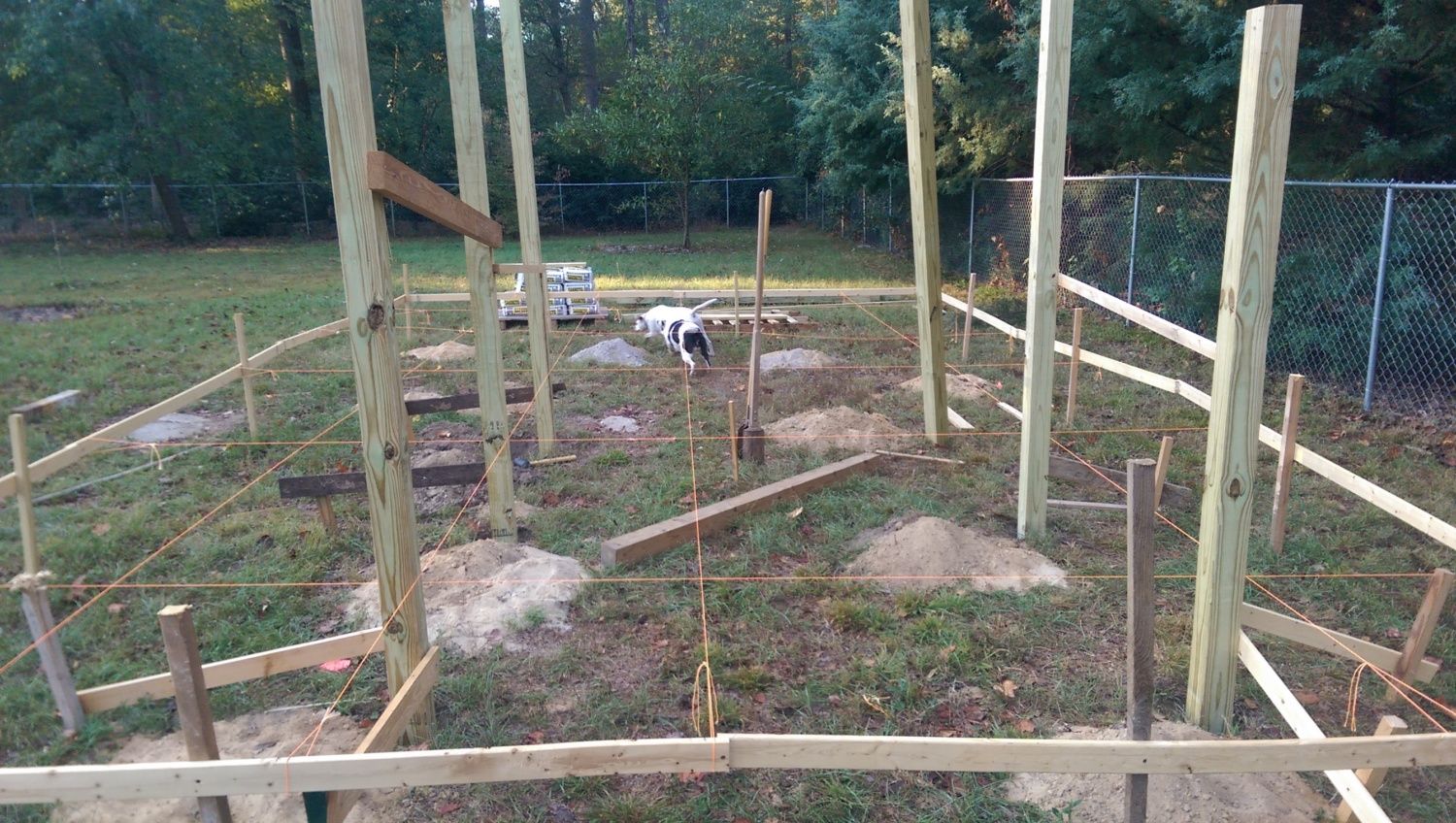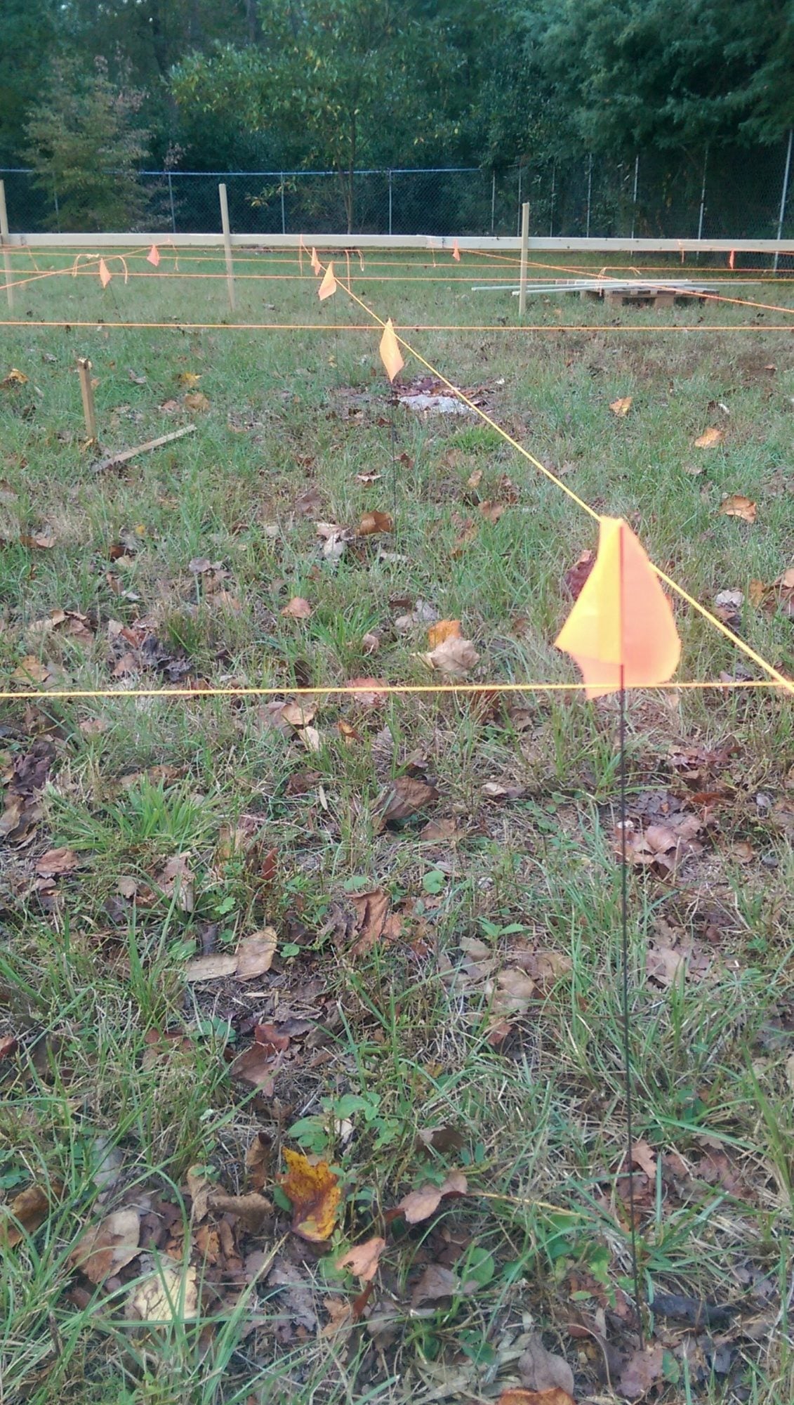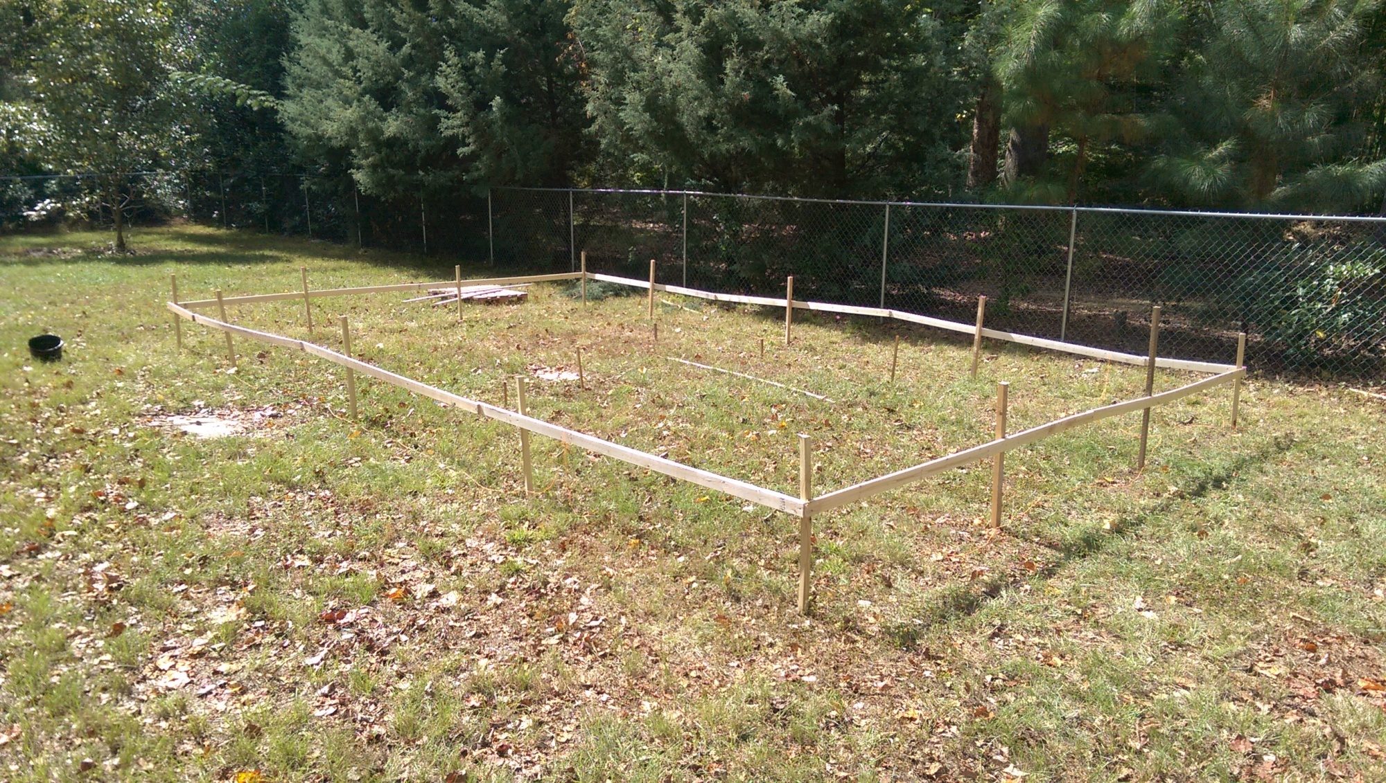 Squaring up the posts. Consider making your batter boards slightly taller than your dogs so the dogs don't keep moving your strings around. Also, bracing the posts higher up is more secure. These are low because I was trying not to interfere with the strings, which I could have done by placing the braces on the non-string sides of the posts. Anyway, we are in a drought, so with no rain or even any wind to speak of, I wasn't too worried about the posts tipping. Each is resting on top of a plate of cured concrete.