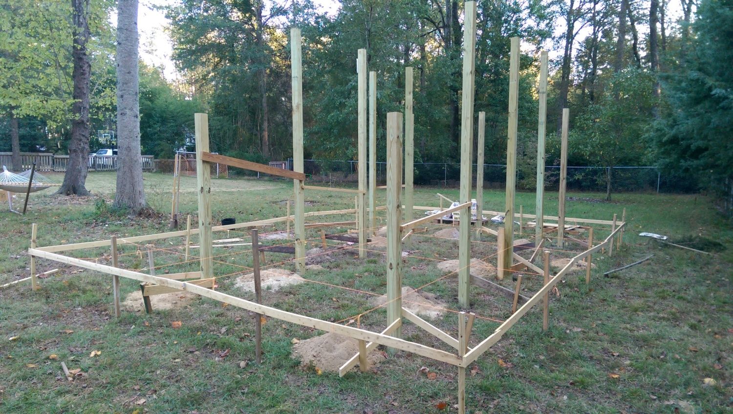 The batter boards. I've seen batter boards done only on the corners, but this gave me more confidence in placing strings that crossed where posts should go.