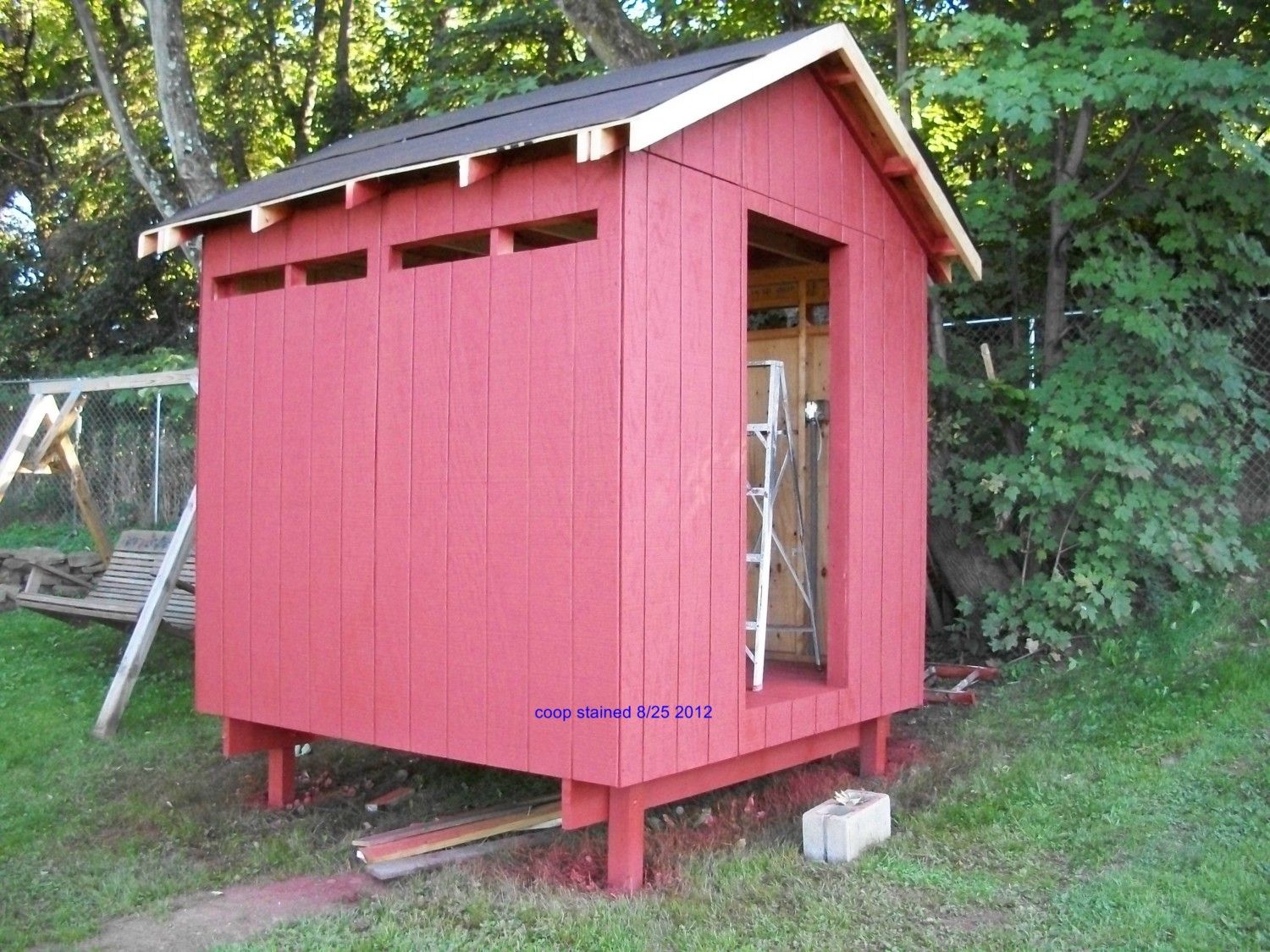 Up date on my coop the roof is on except for the shingles .Hope to start the trim this week.I used a Wagner power painter with the stain It made easy work of it.